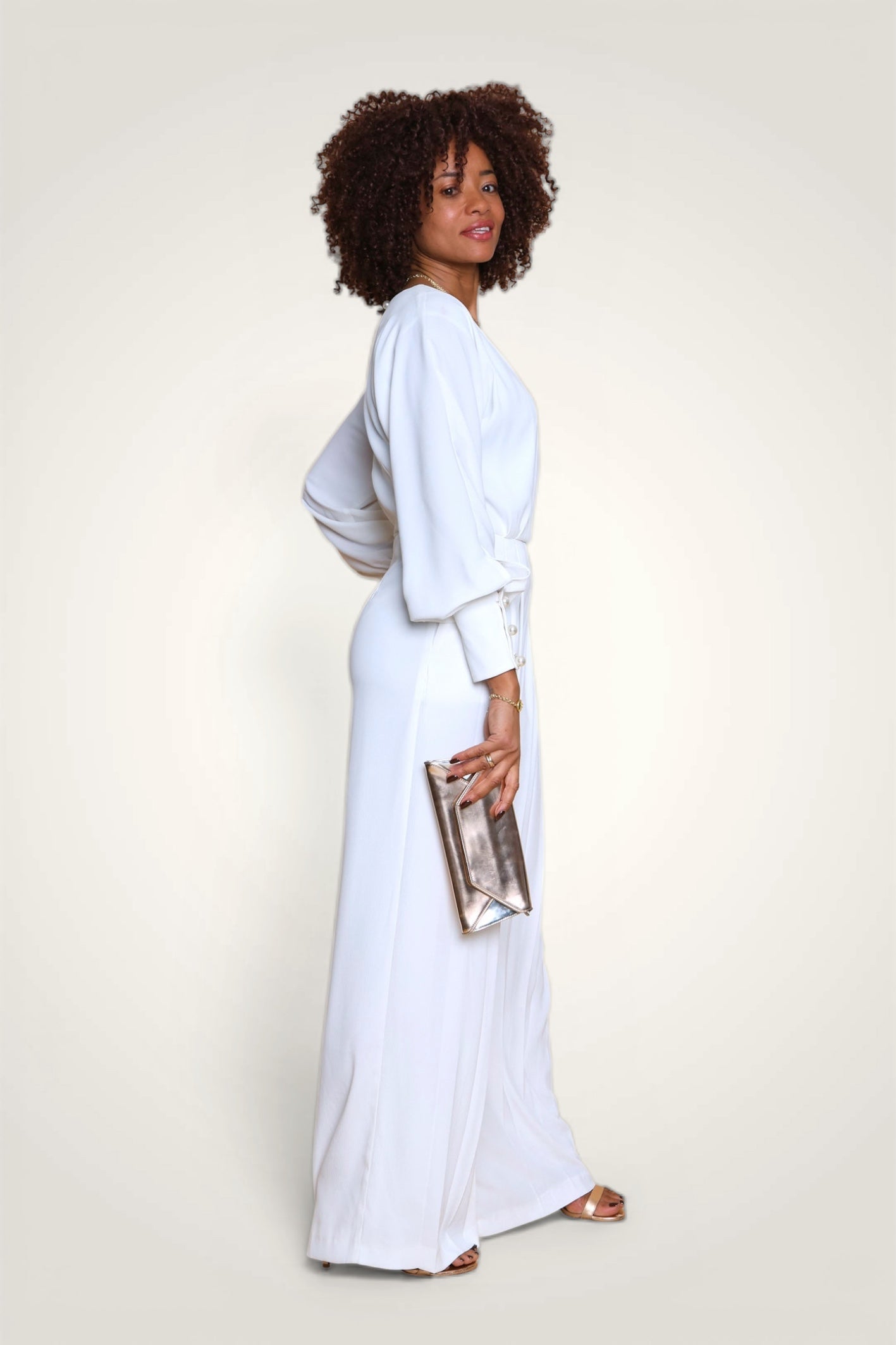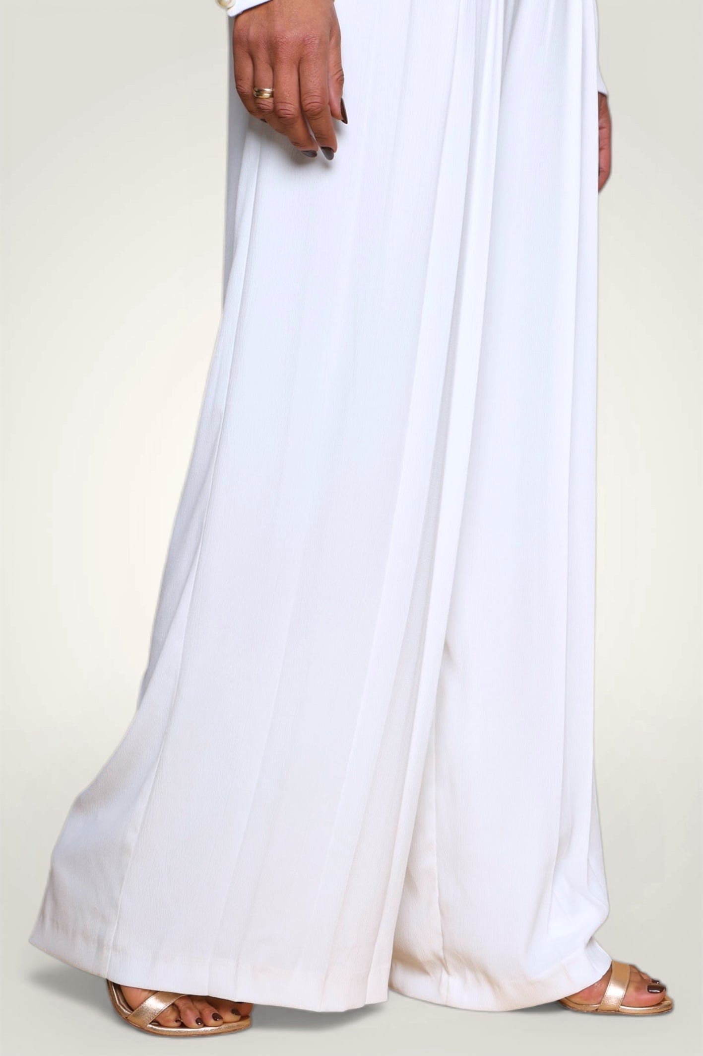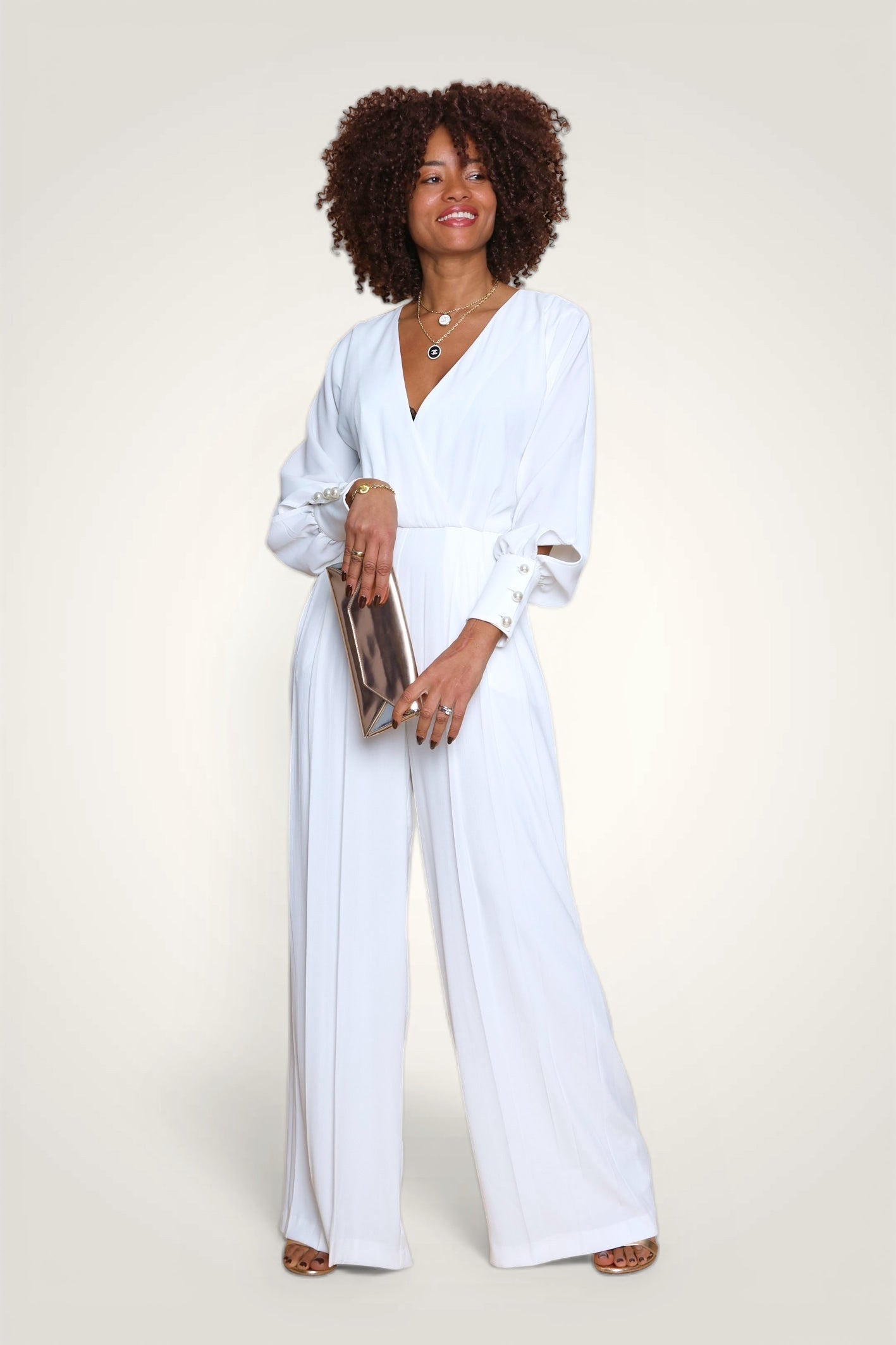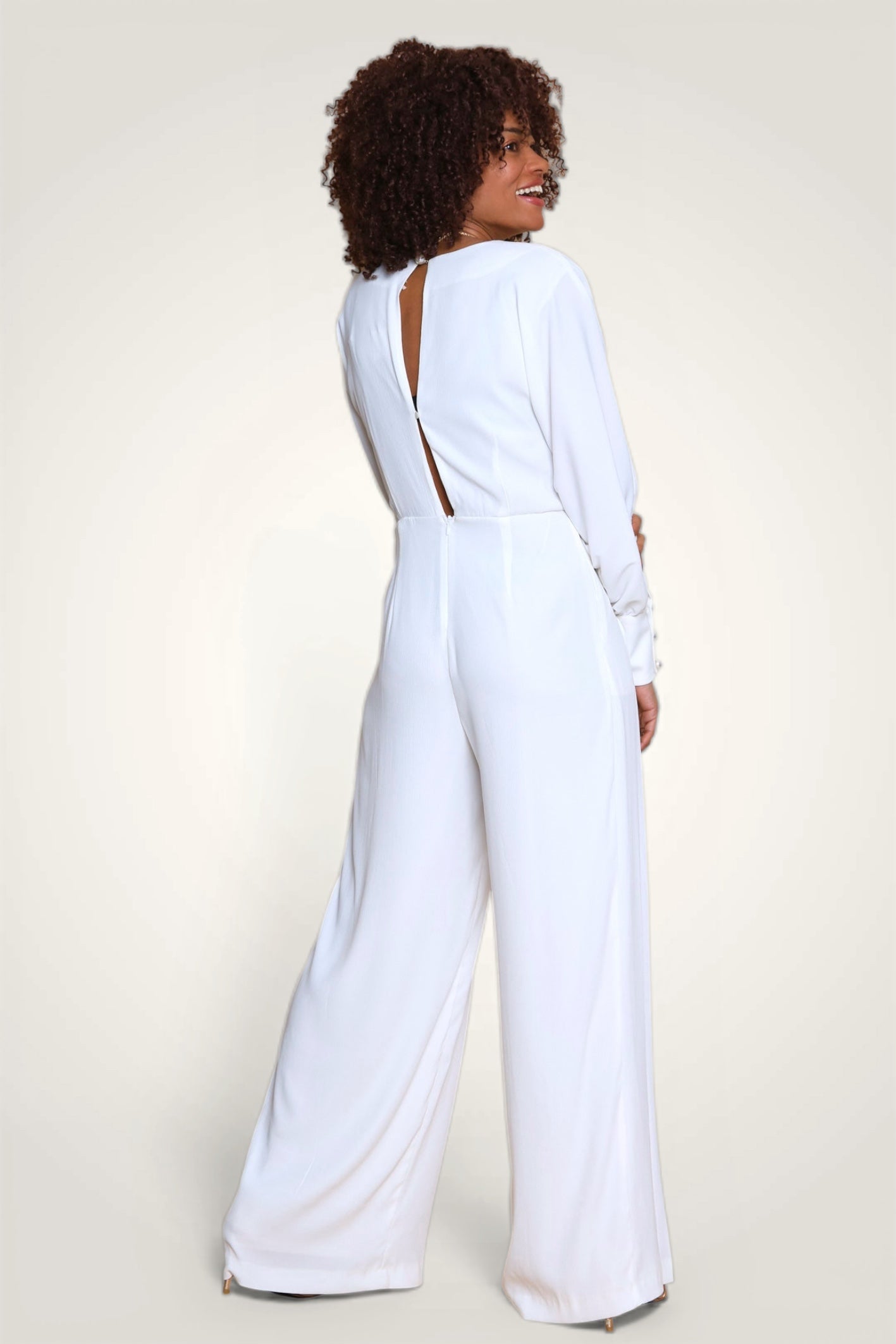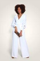 - Design : Ligne cintrée, taille marquée avec un décolleté profond - Ouverture au dos avec petit bouton invisible au milieu du dos - Jambe large plissée partiellement