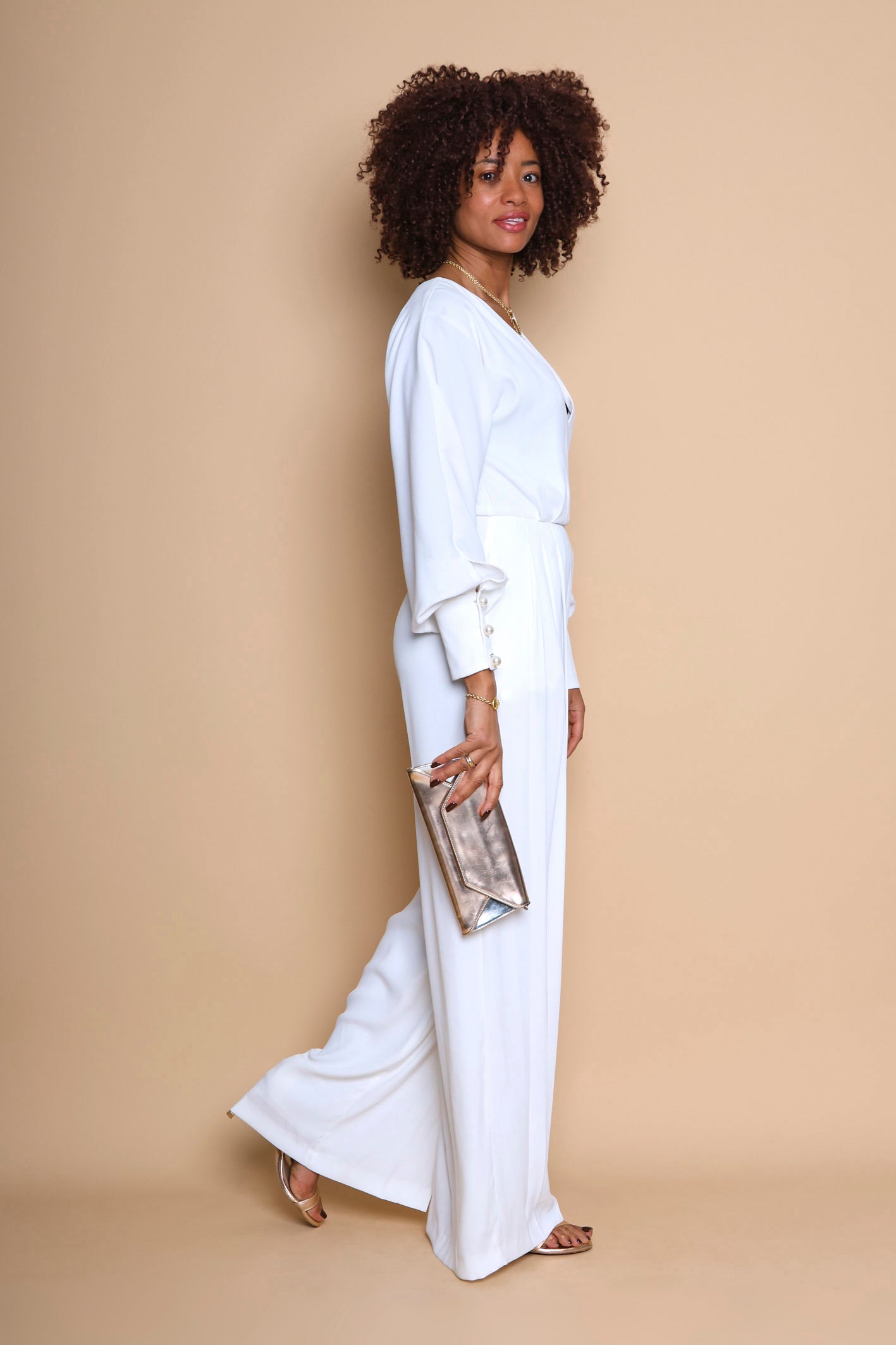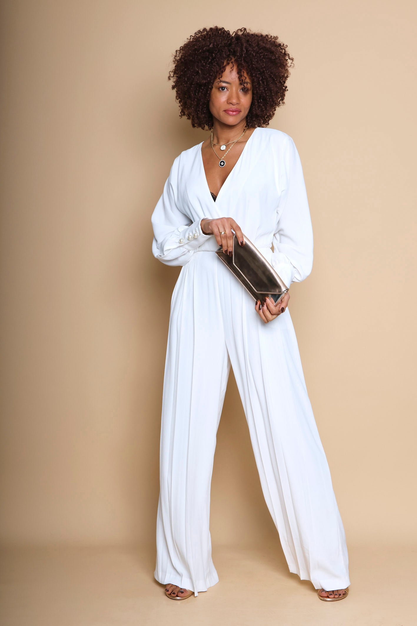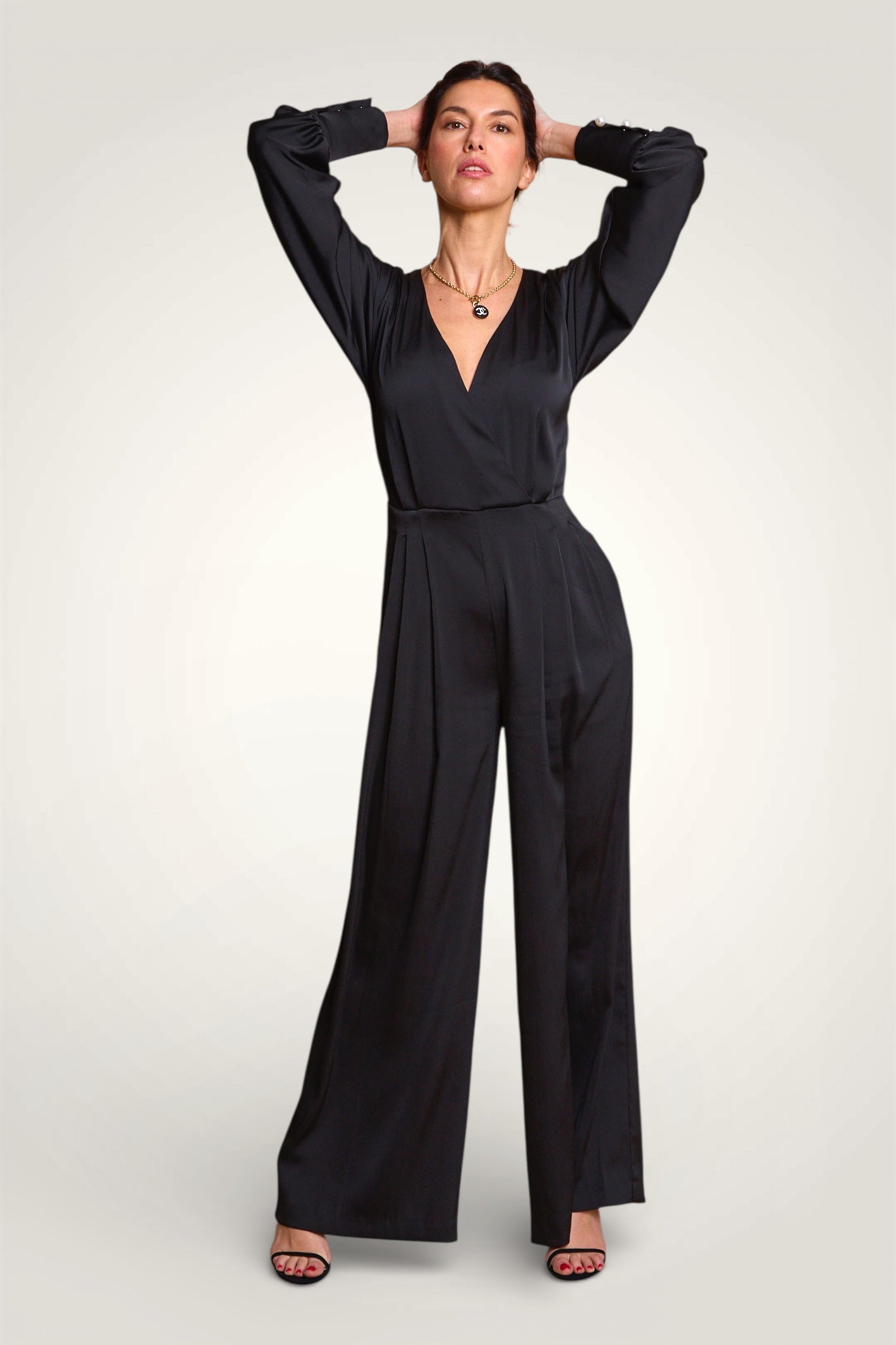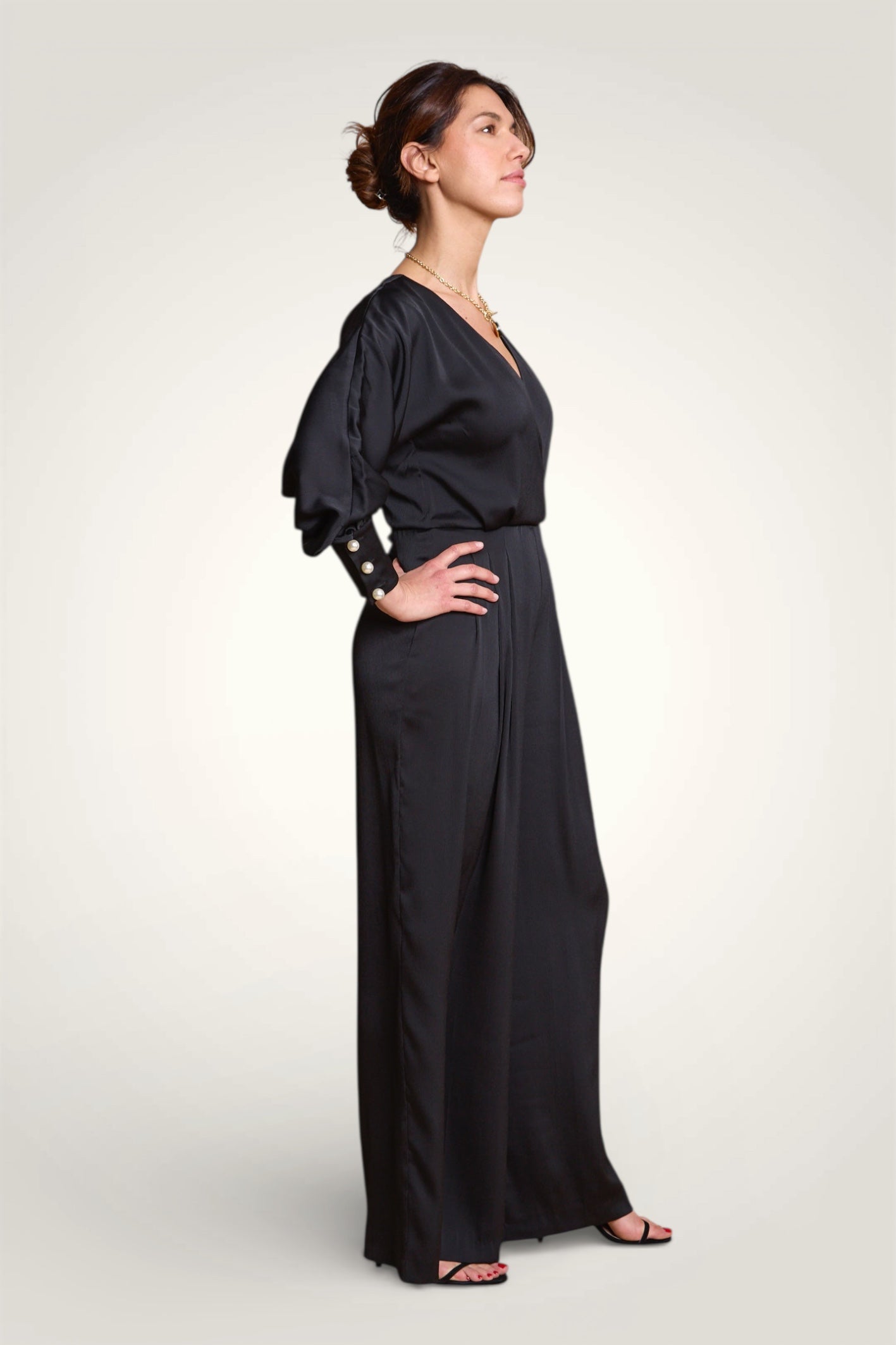 - Design : Ligne cintrée, taille marquée avec un décolleté profond - Ouverture au dos avec petit bouton invisible au milieu du dos - Jambe large plissée partiellement