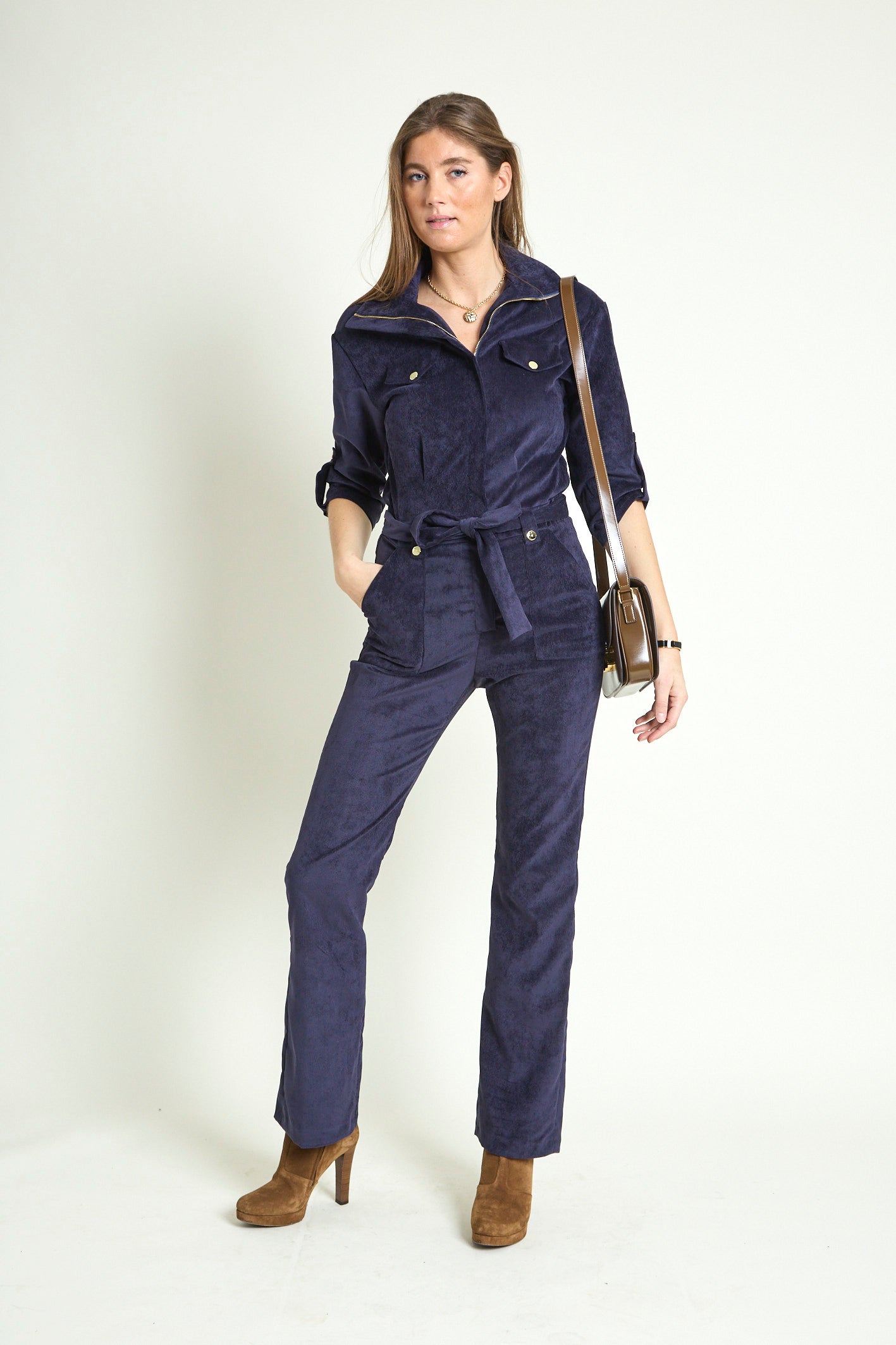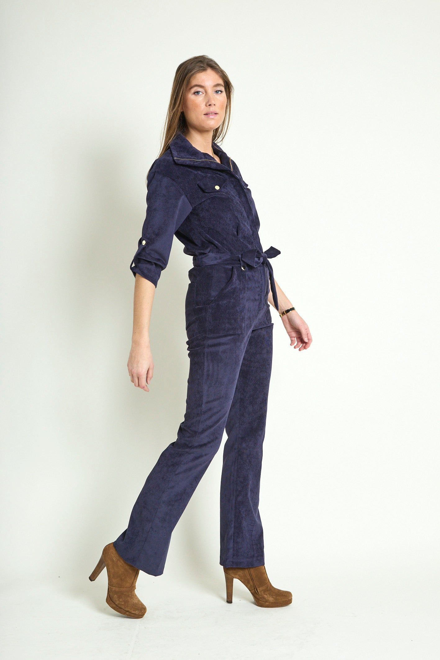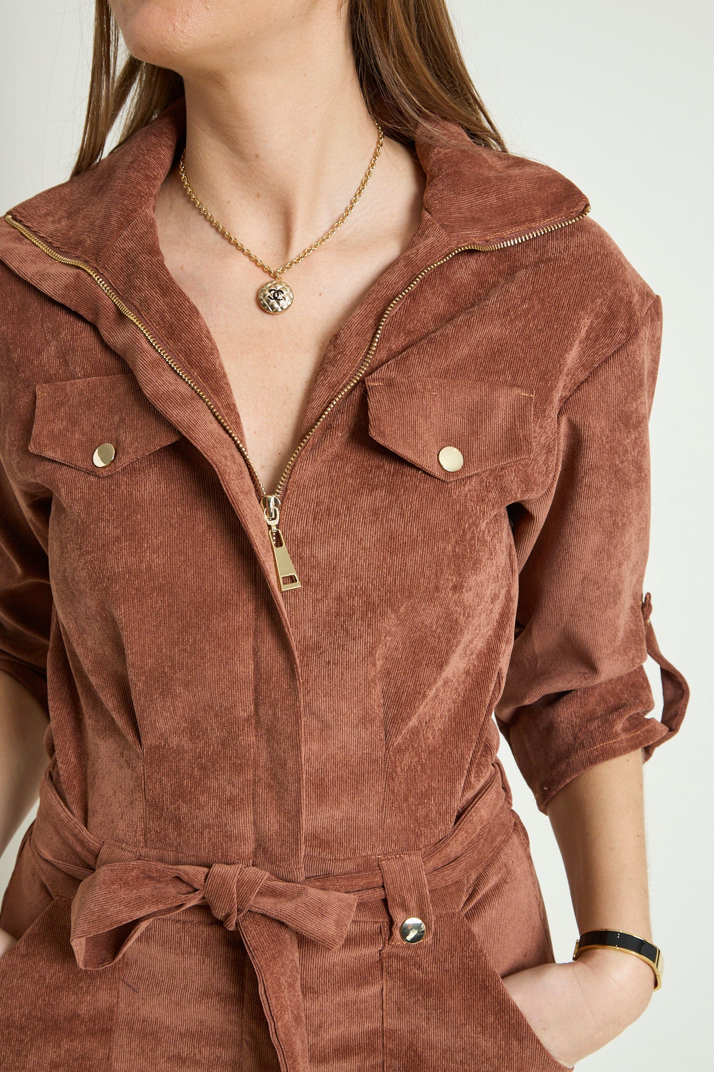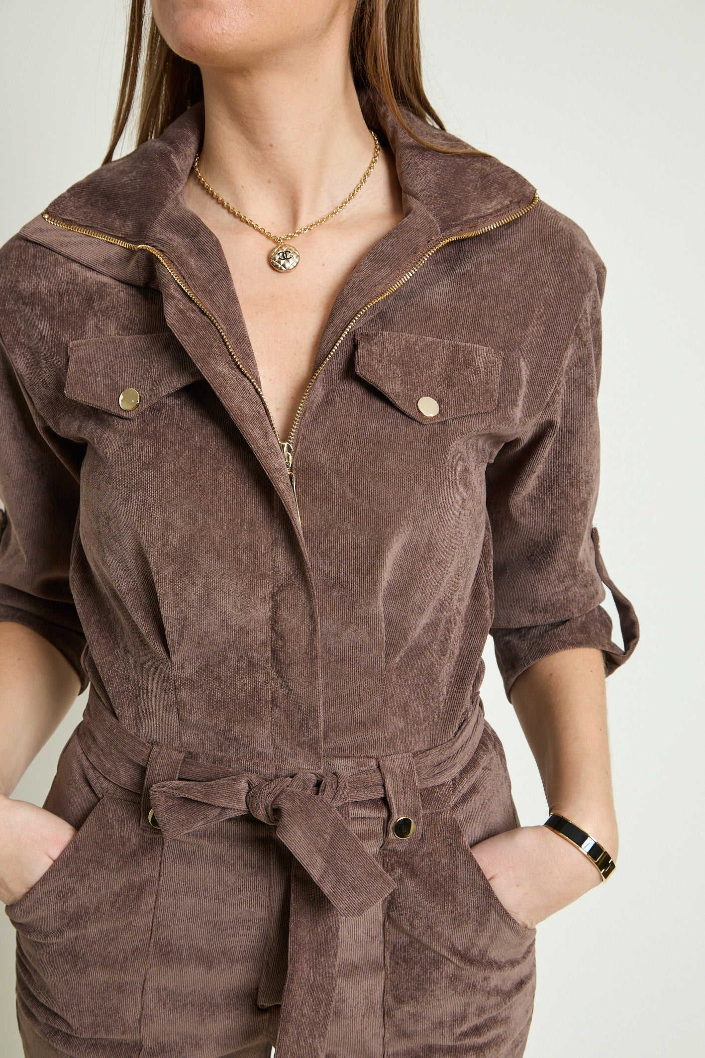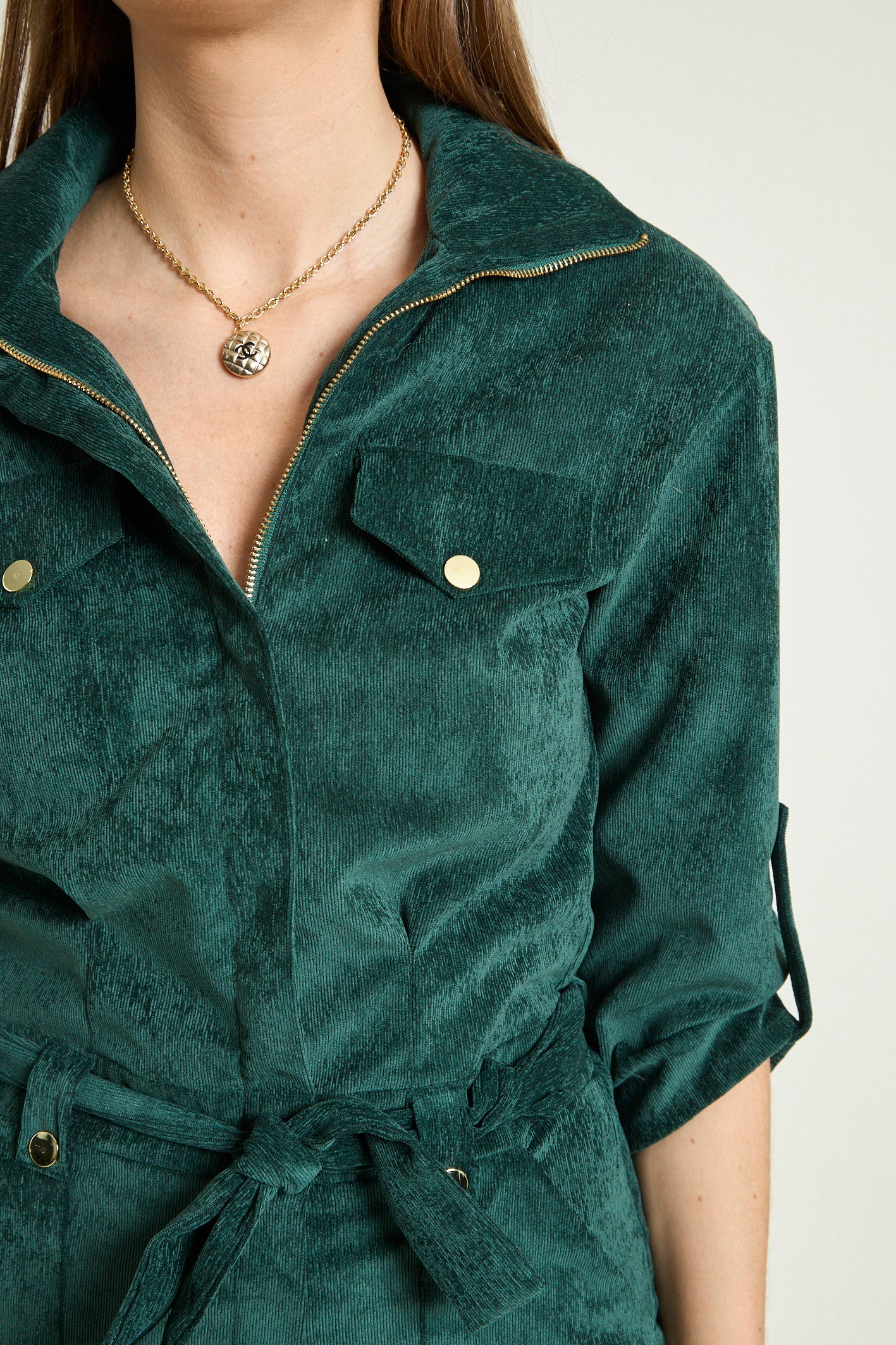 - Détails : Rabats de poche sur la poitrine, col montant avec un gros zip light gold, pressions metal light gold sur les rabats et les passants devant, manches 3/4 retroussables avec patte + pression, ceinture légèrement élastiquée au dos pour marquer la taille et ceinture amovible à nouer. Poches plaquées devant.