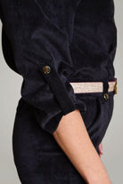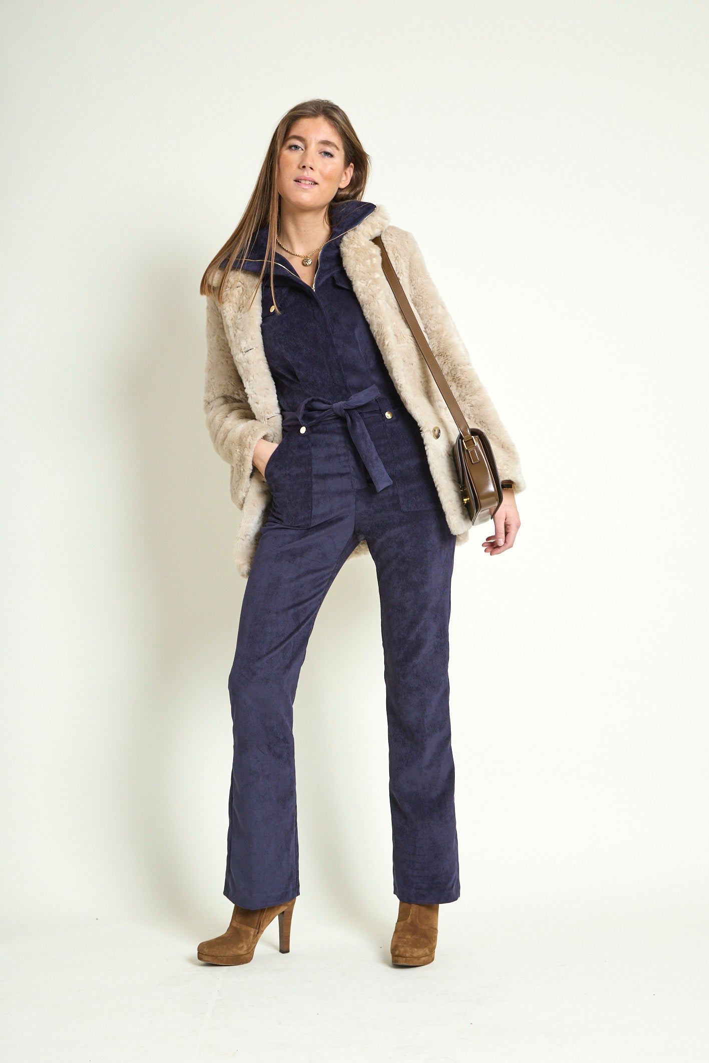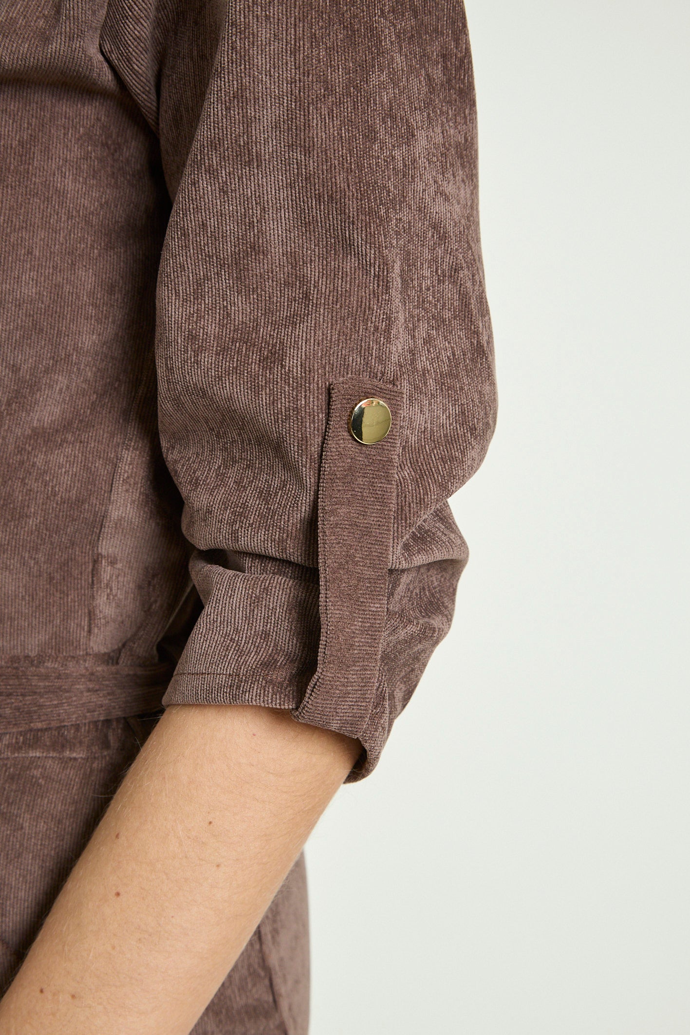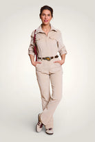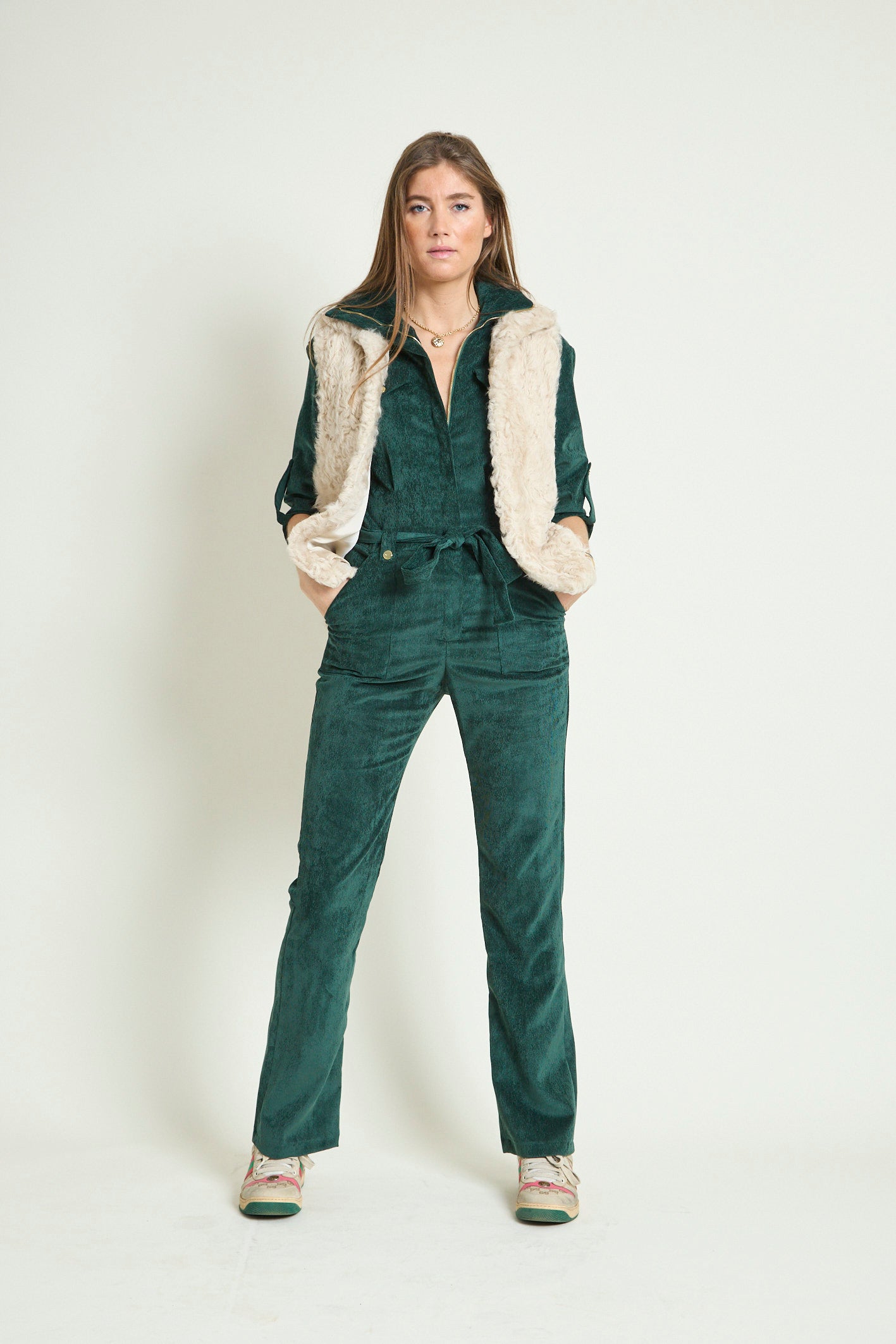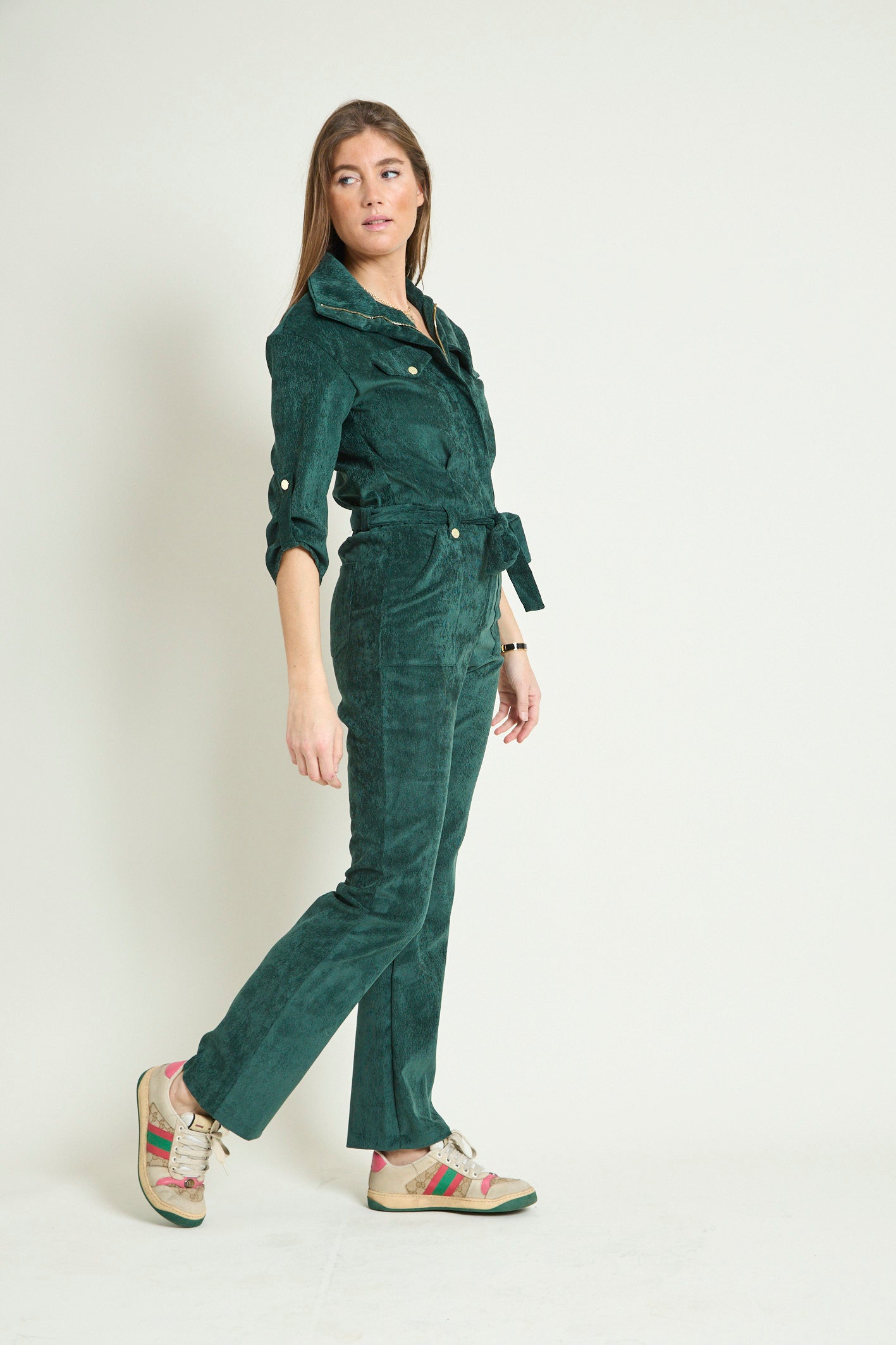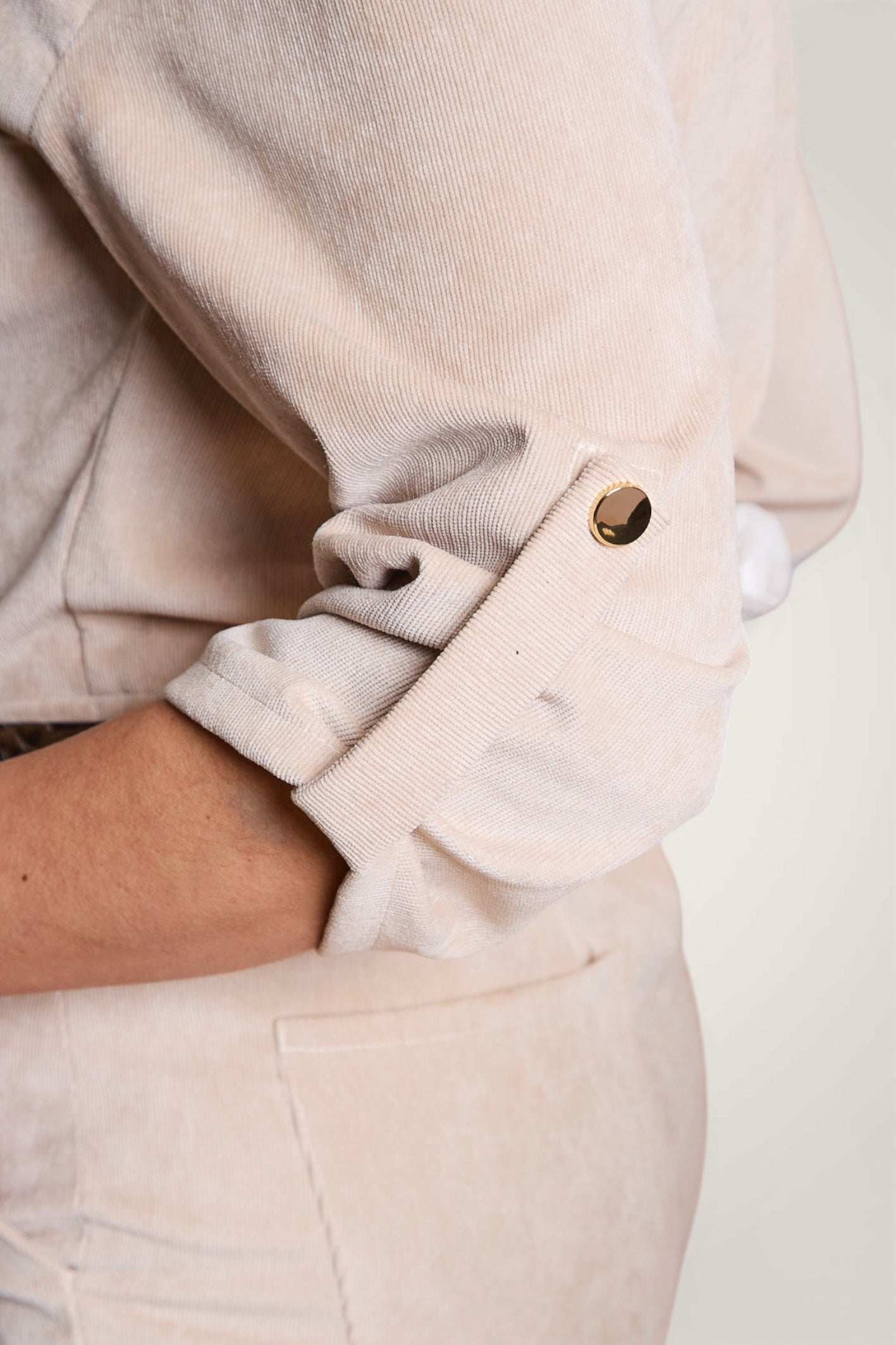 - Détails : Rabats de poche sur la poitrine, col montant avec un gros zip light gold, pressions metal light gold sur les rabats et les passants devant, manches 3/4 retroussables avec patte + pression, ceinture légèrement élastiquée au dos pour marquer la taille et ceinture amovible à nouer. Poches plaquées devant.