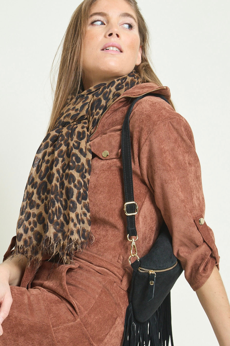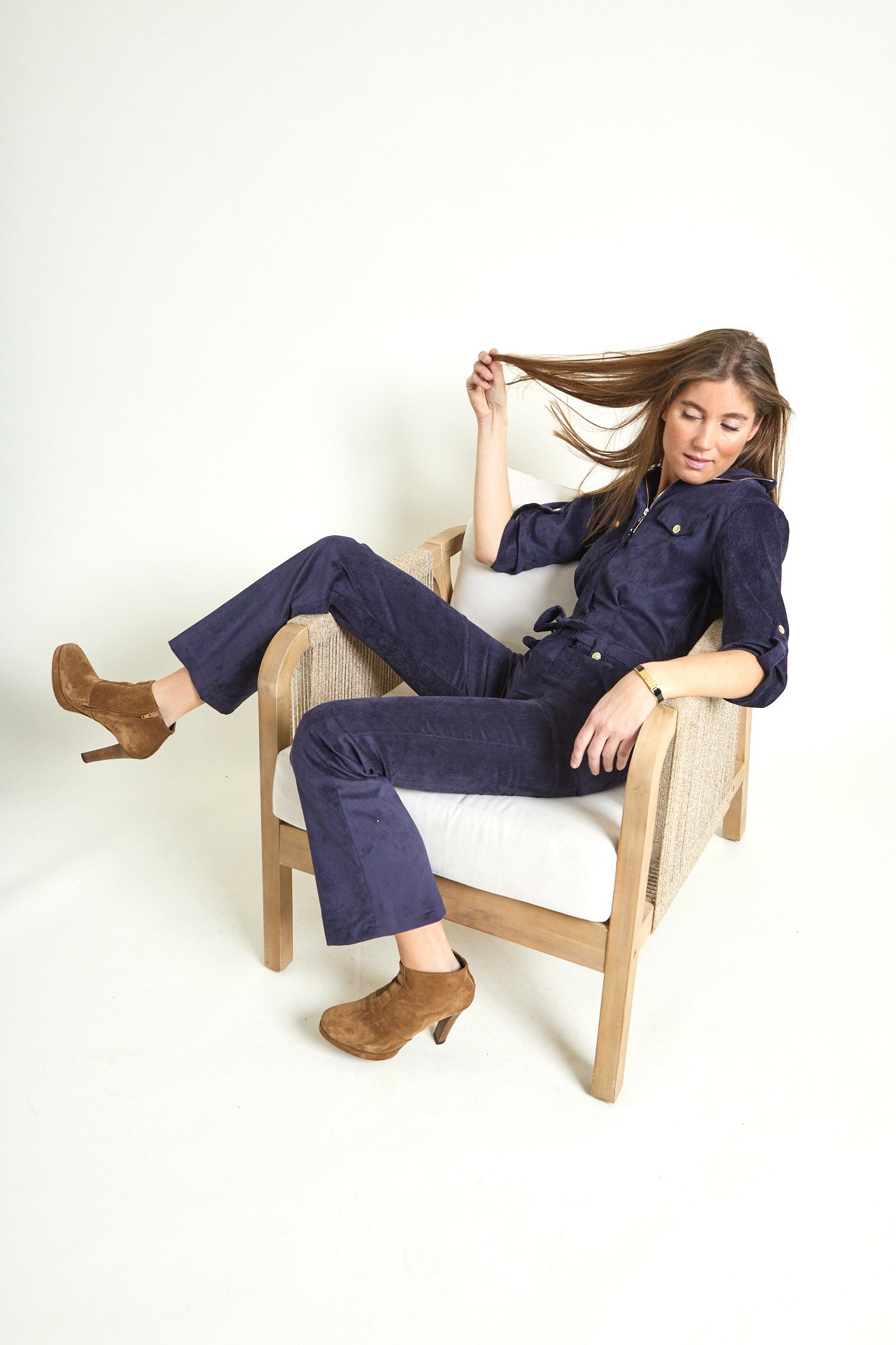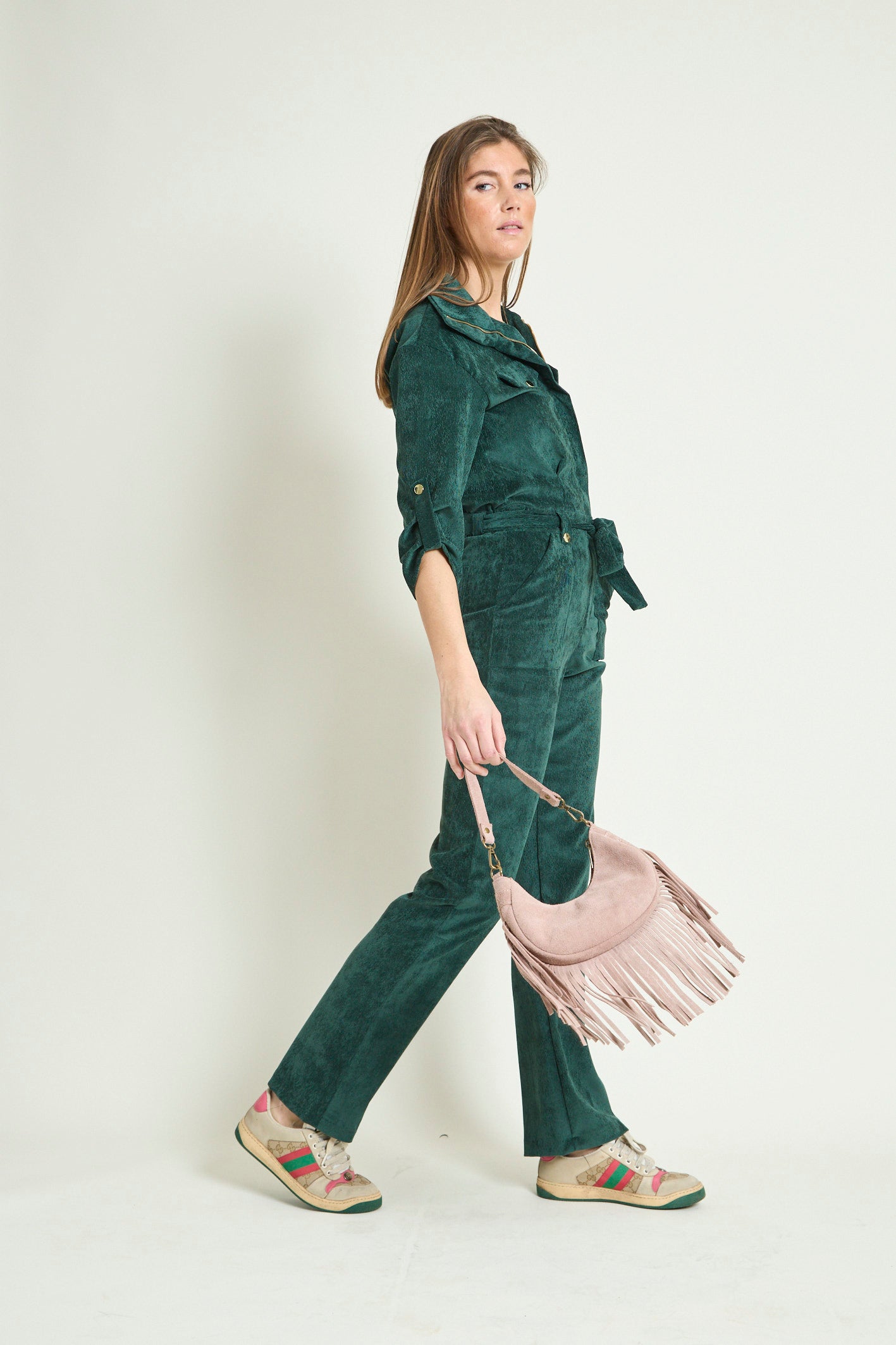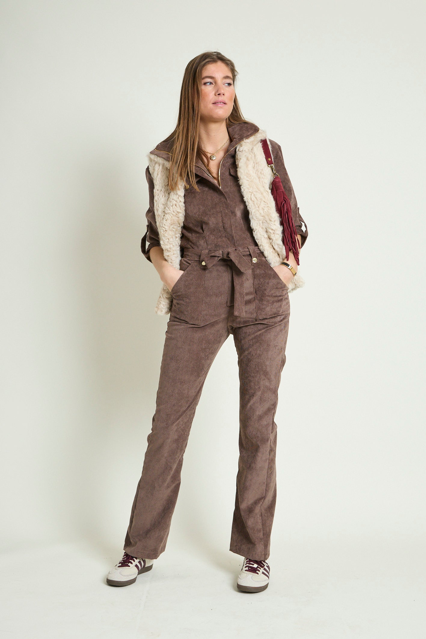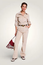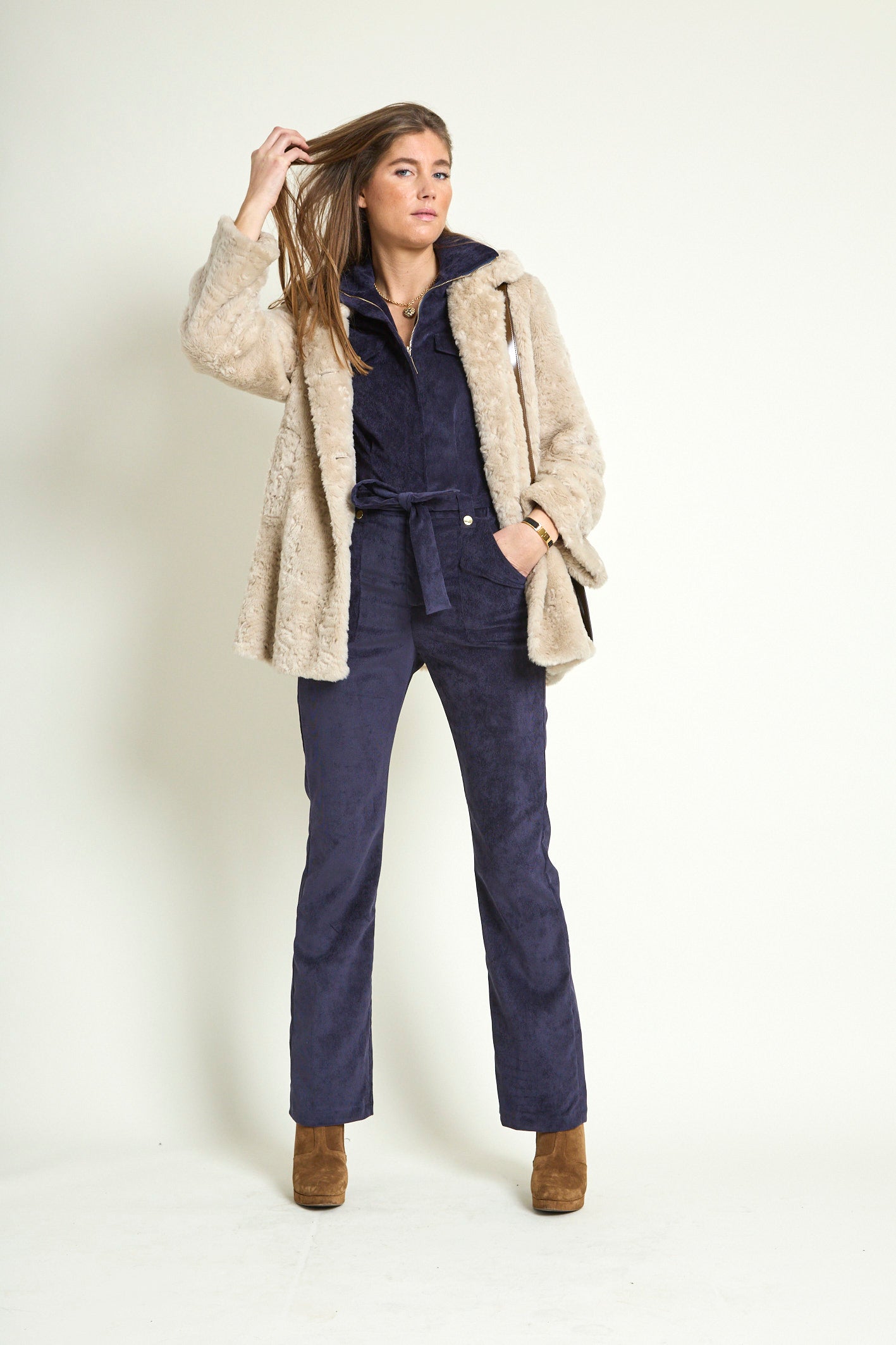 - Détails : Rabats de poche sur la poitrine, col montant avec un gros zip light gold, pressions metal light gold sur les rabats et les passants devant, manches 3/4 retroussables avec patte + pression, ceinture légèrement élastiquée au dos pour marquer la taille et ceinture amovible à nouer. Poches plaquées devant.