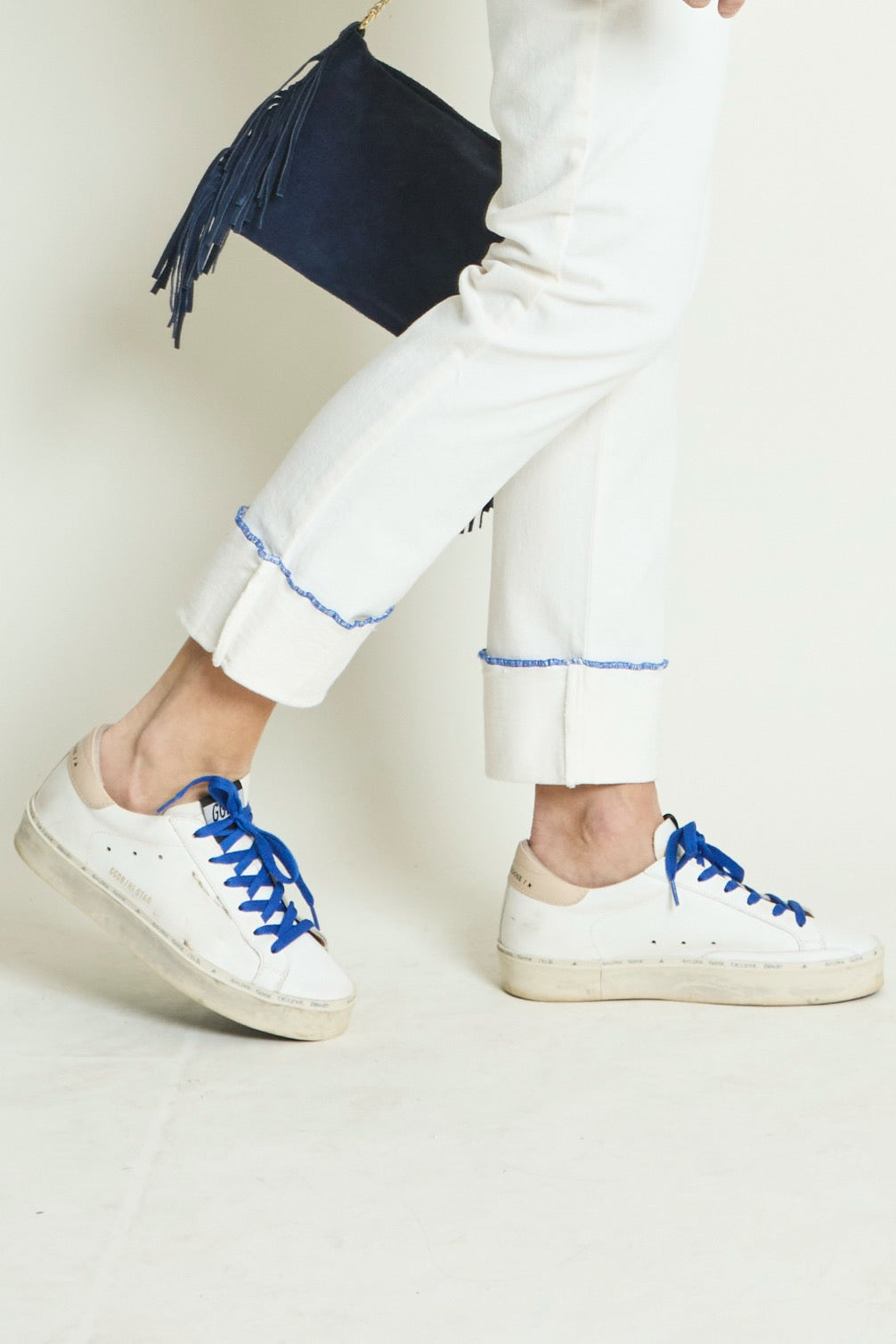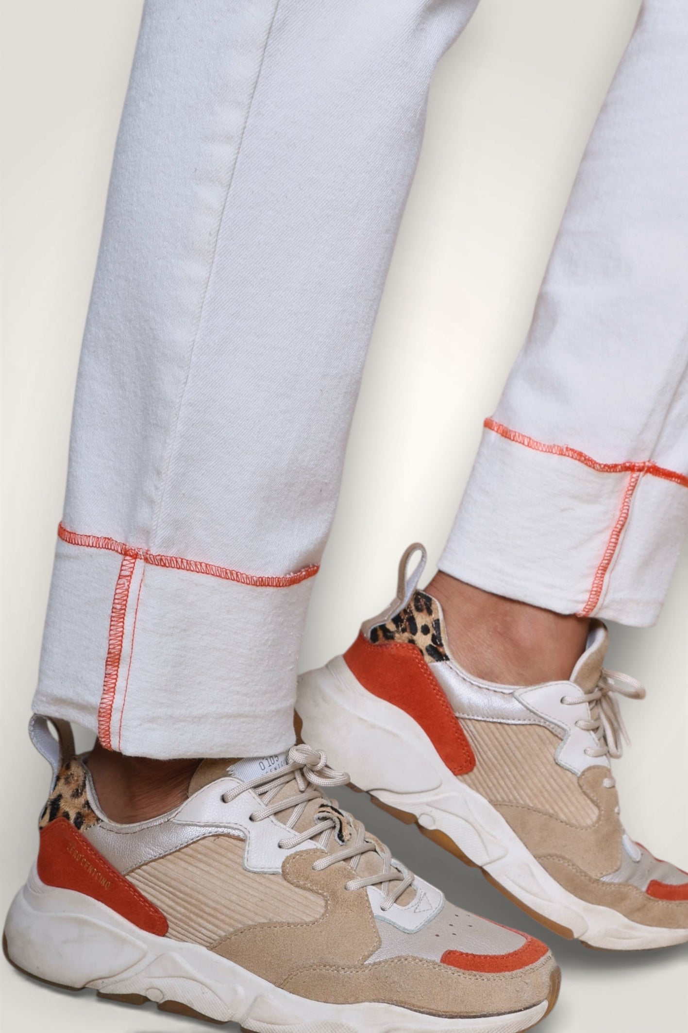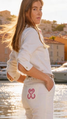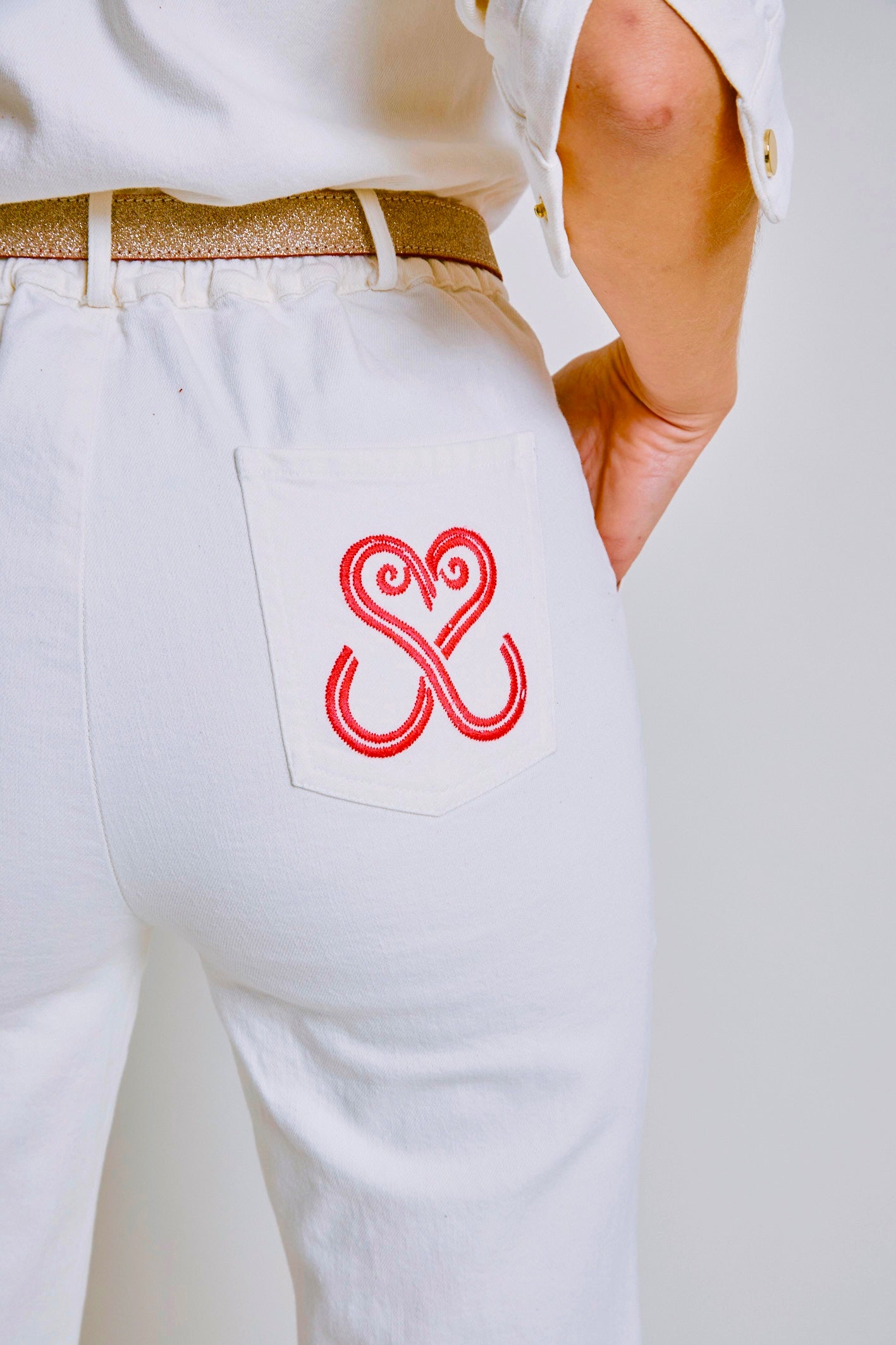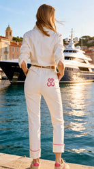 Détails : Poches plaquées, zip apparent contrasté en métal light gold, pressions light gold, coutures des revers contrastées en bas de jambe, broderie contrastée sur une poche dos.