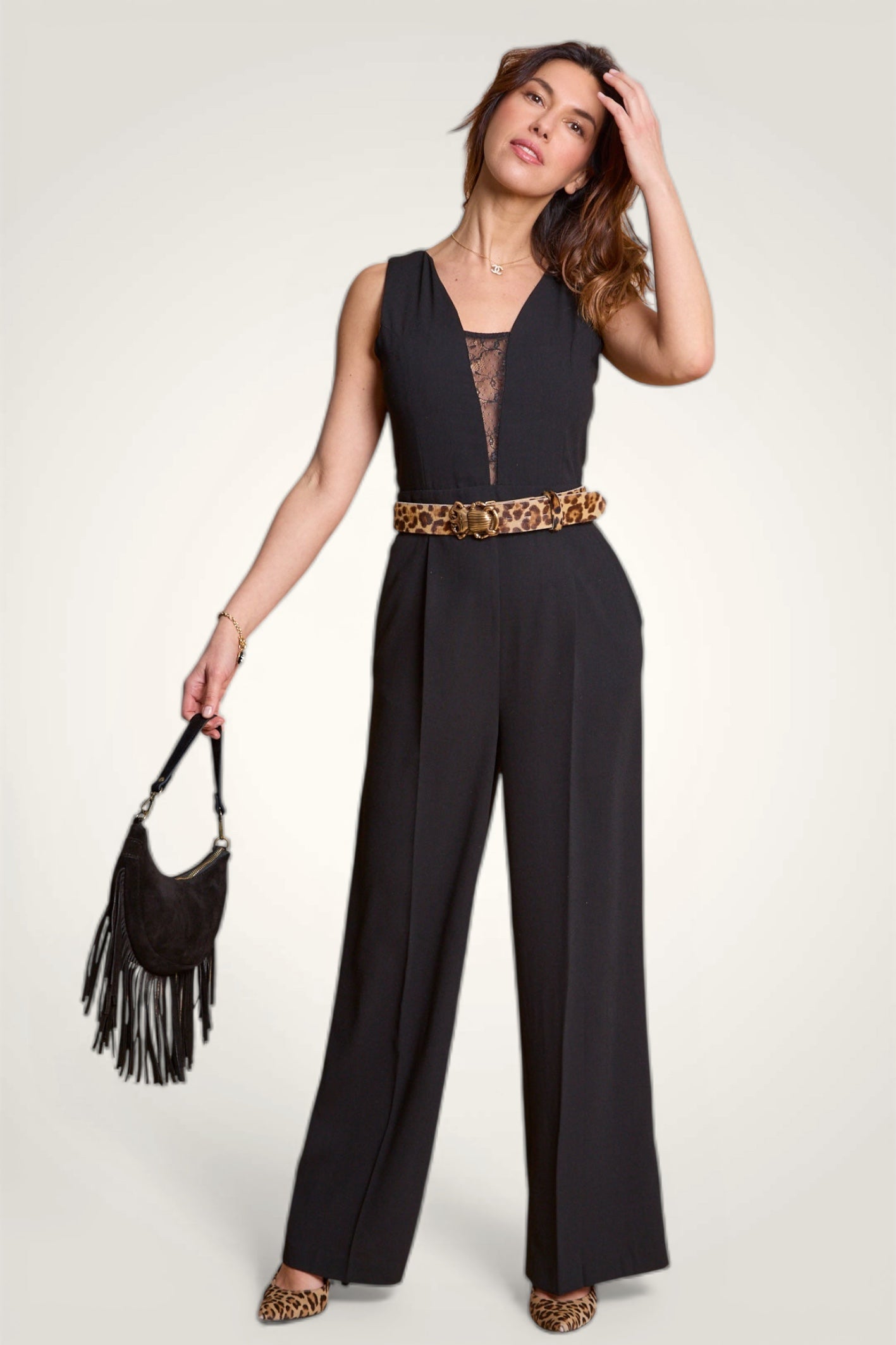 - Design : Ligne cintrée avec un décolleté profond en dentelle devant et au dos - Jambe large avec pli marqué.