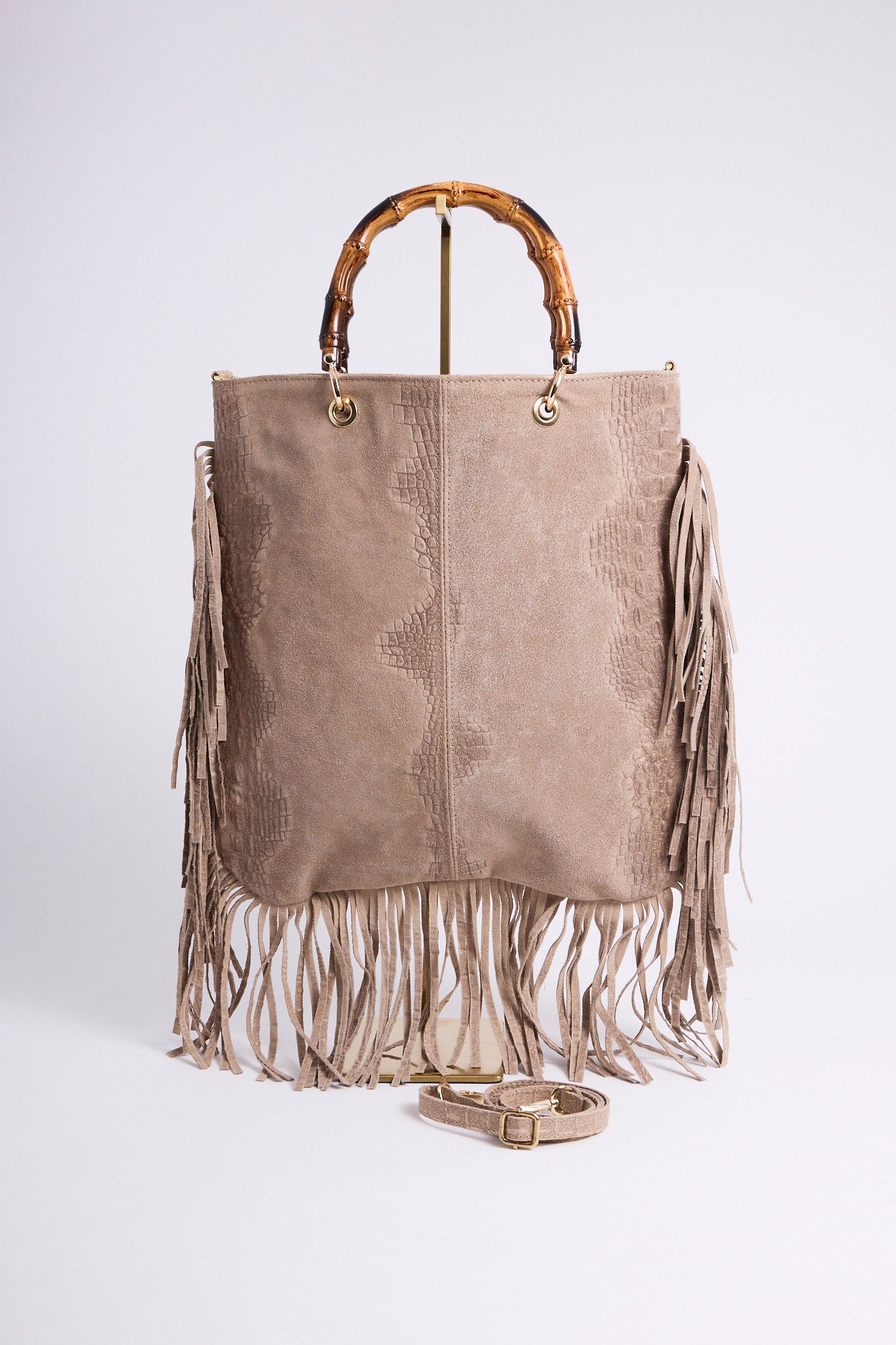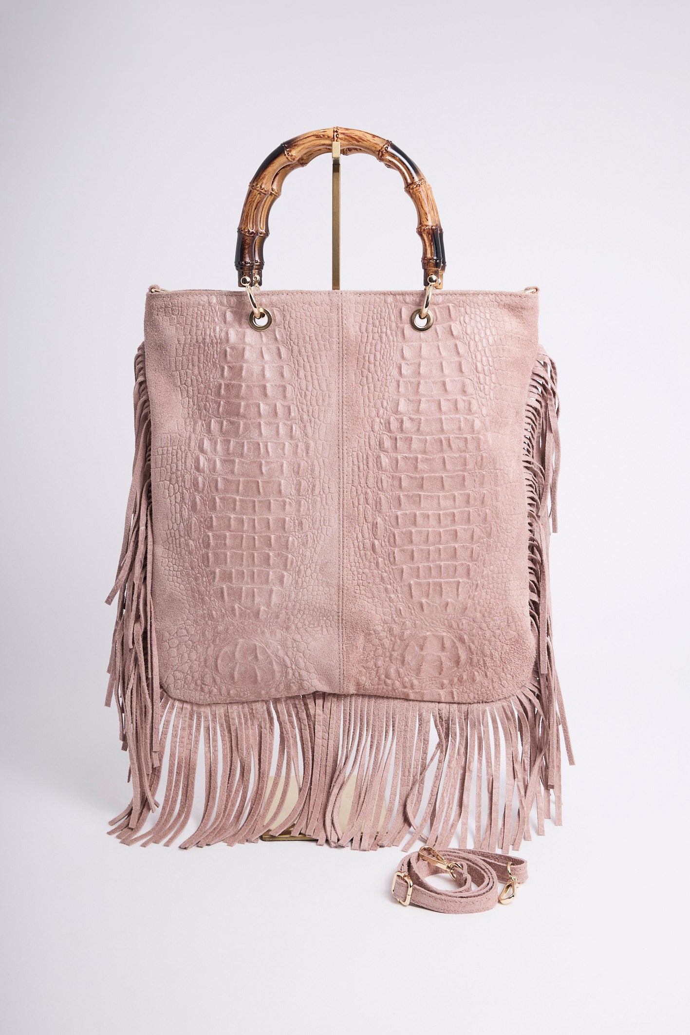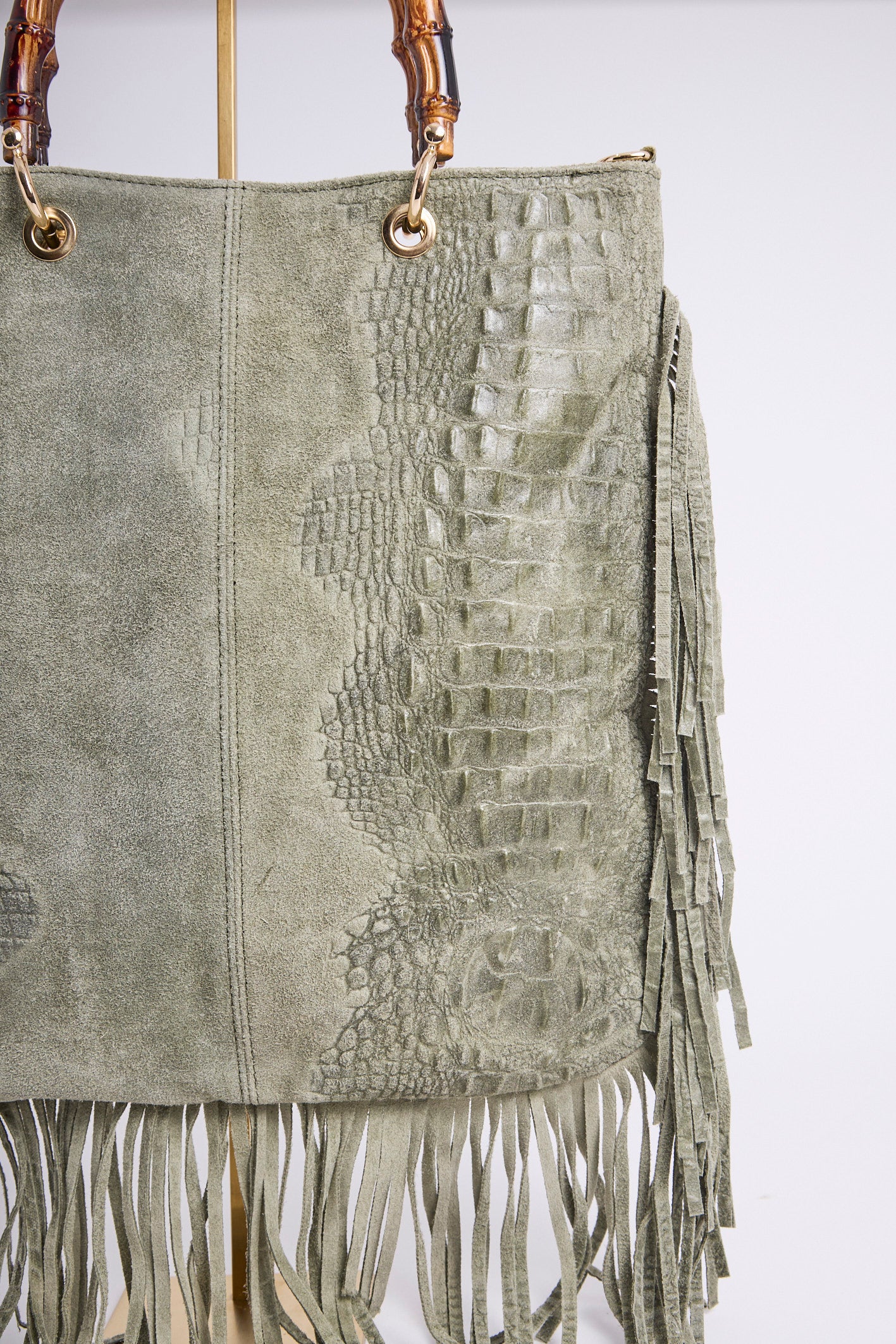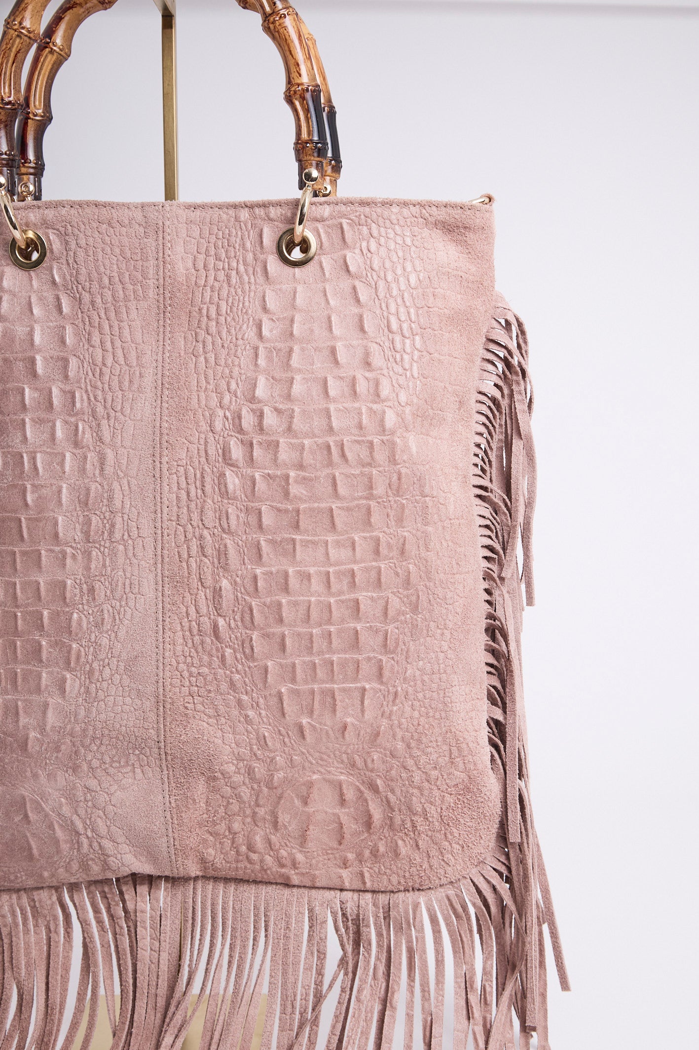 Sac en véritable cuir suédé, embossé effet croco, sublimé de longues franges pour un mouvement bohème.