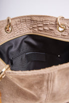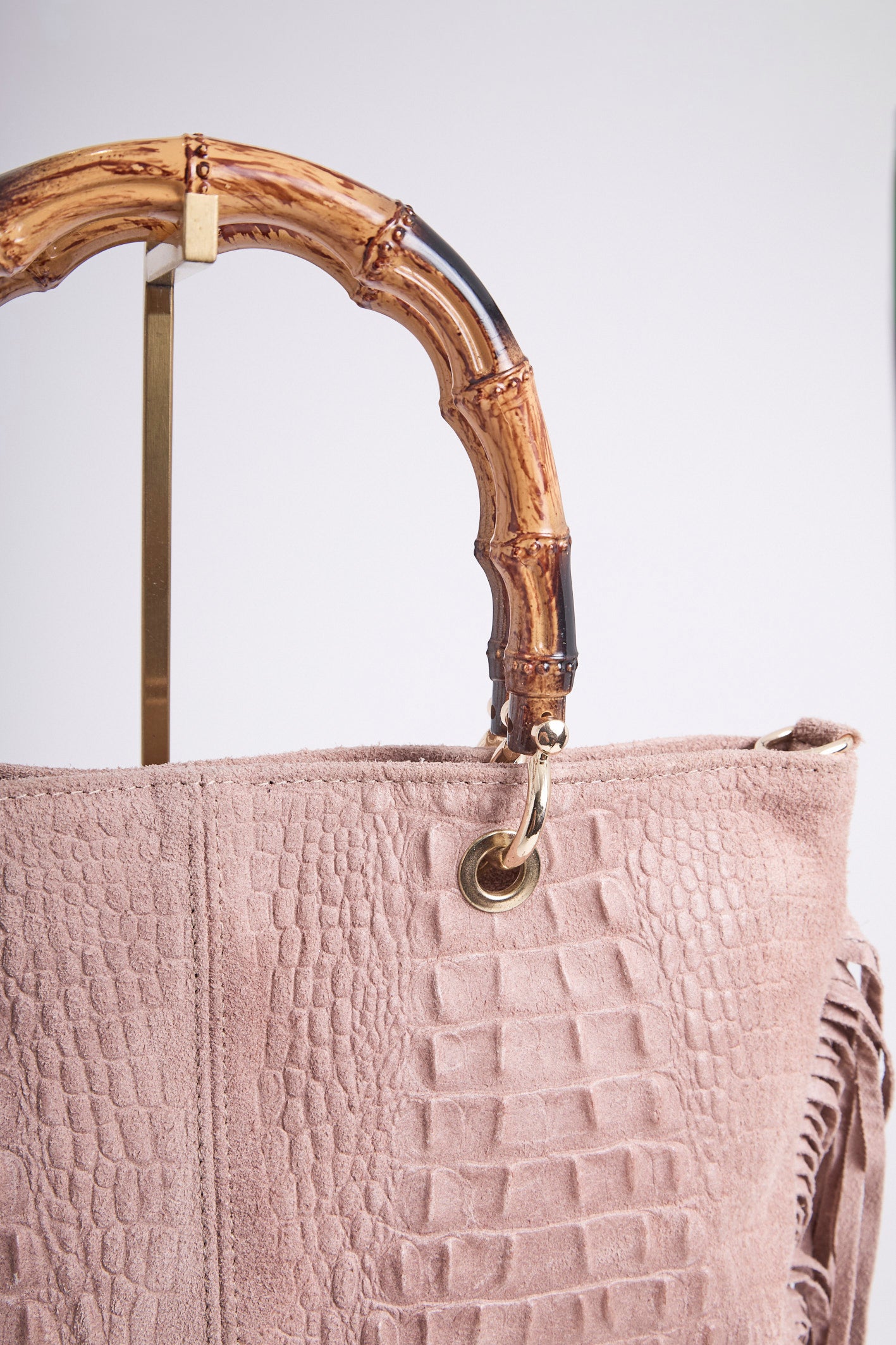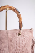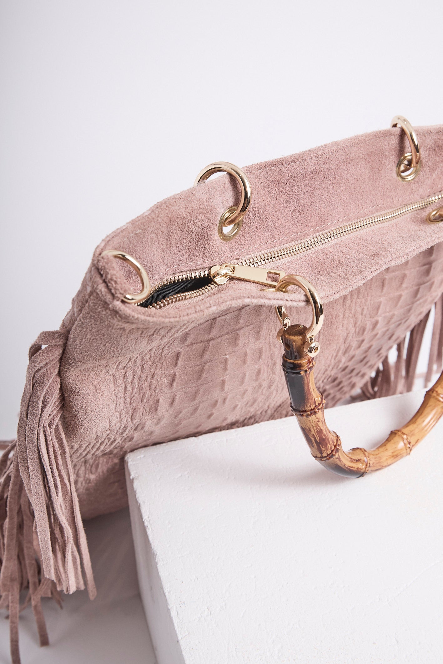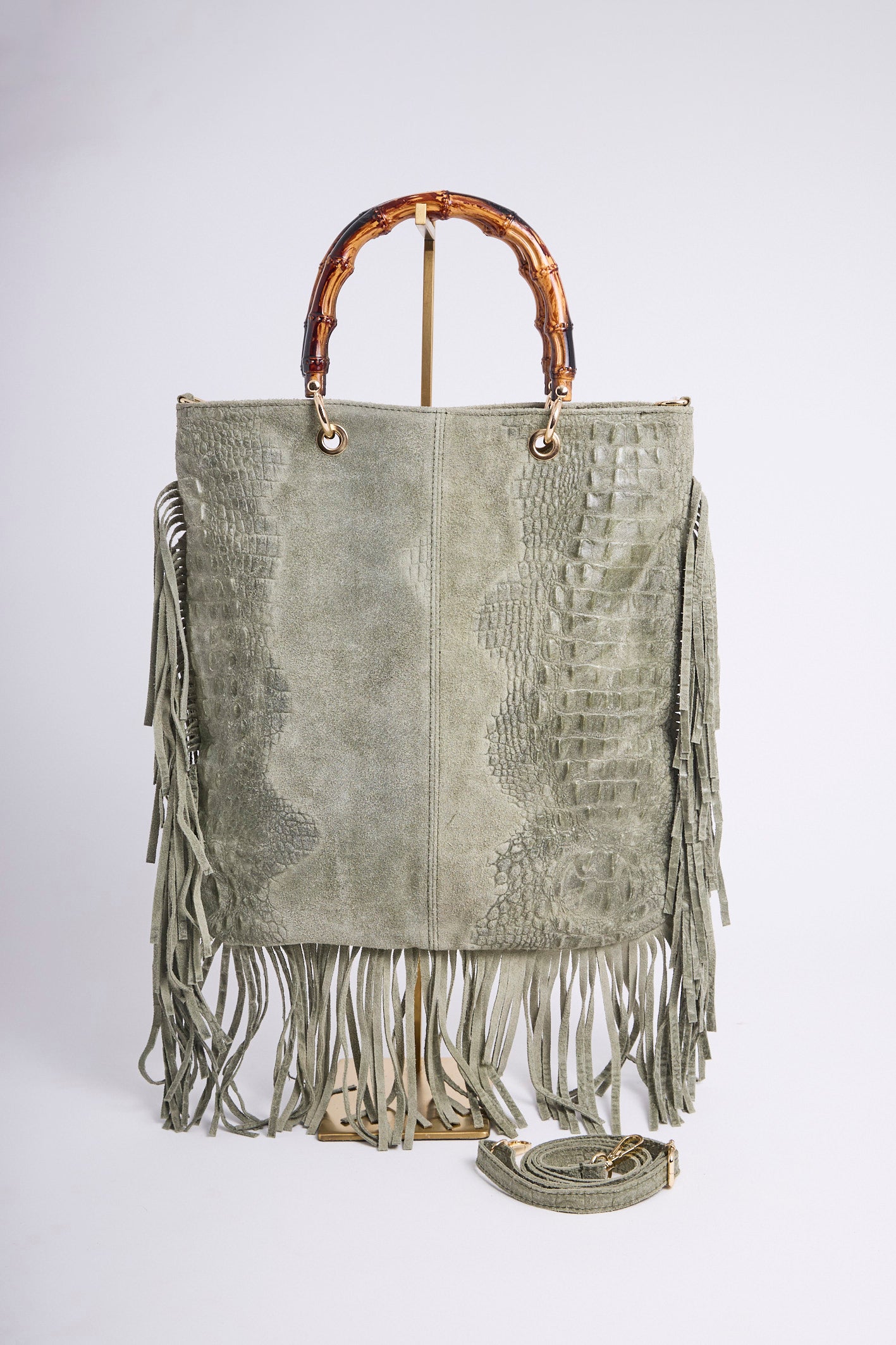 Sac en véritable cuir suédé, embossé effet croco, sublimé de longues franges pour un mouvement bohème.