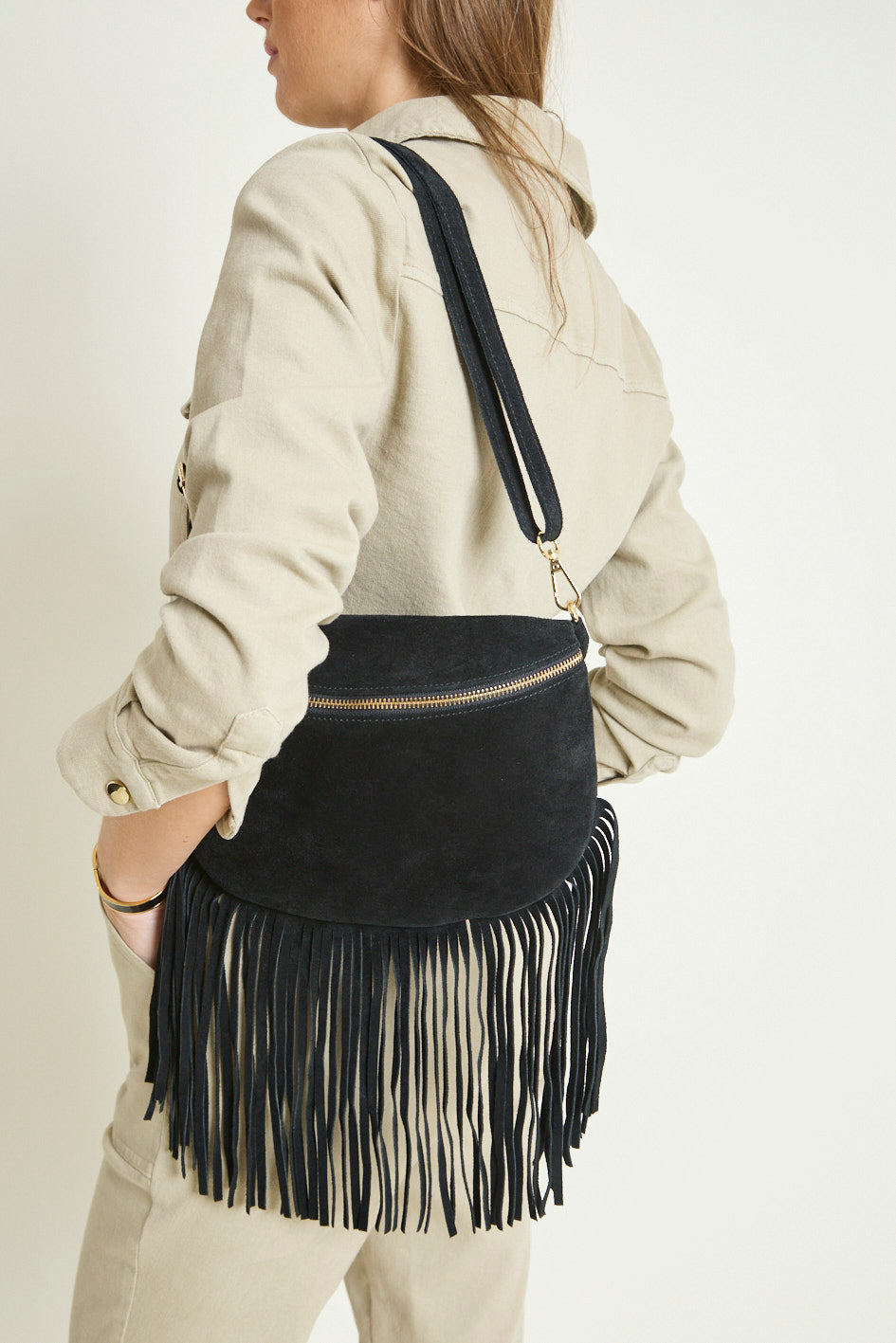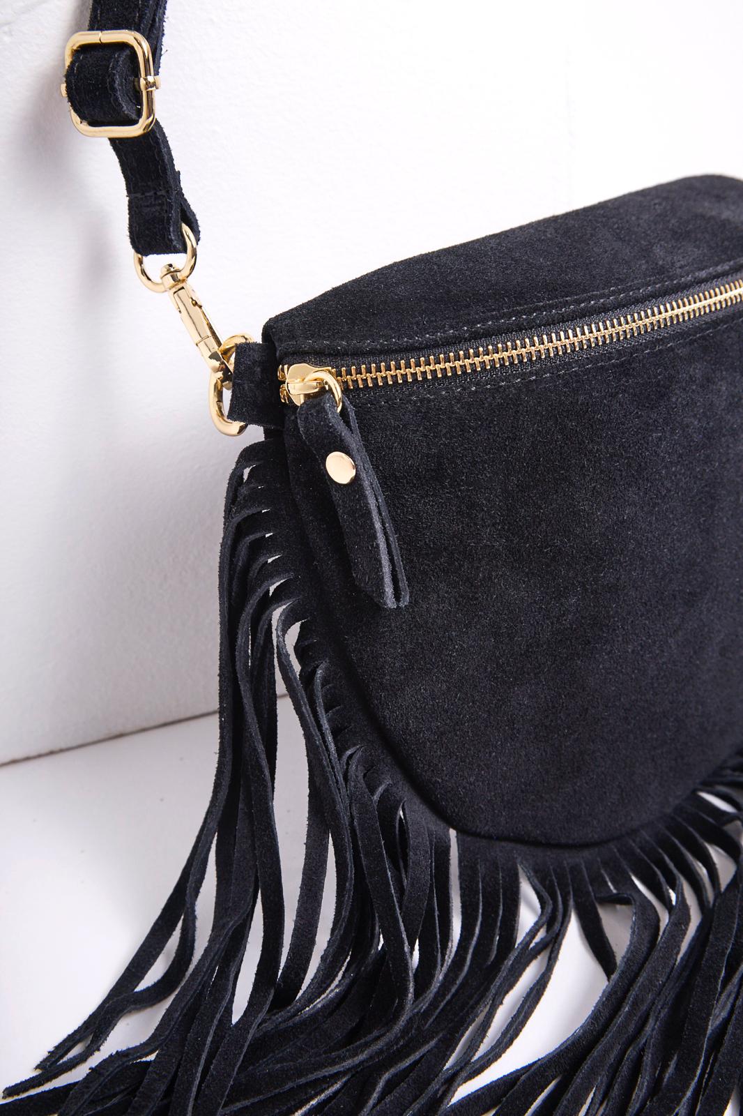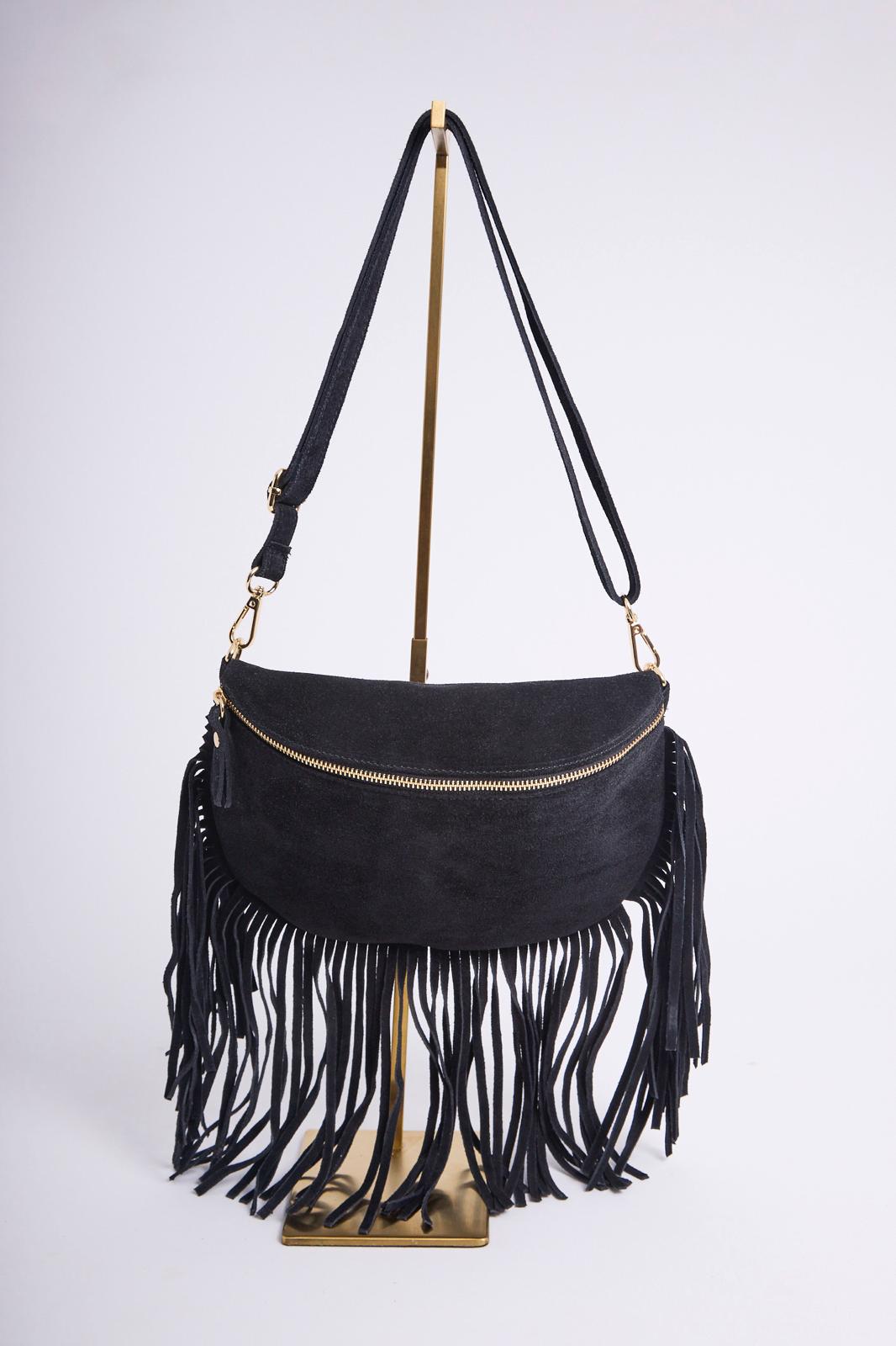 L’indispensable de la saison : la célèbre banane fait son grand retour et frangée ! En cuir suédé noir au toucher velouté, rehaussée de longues franges pour une allure bohème.