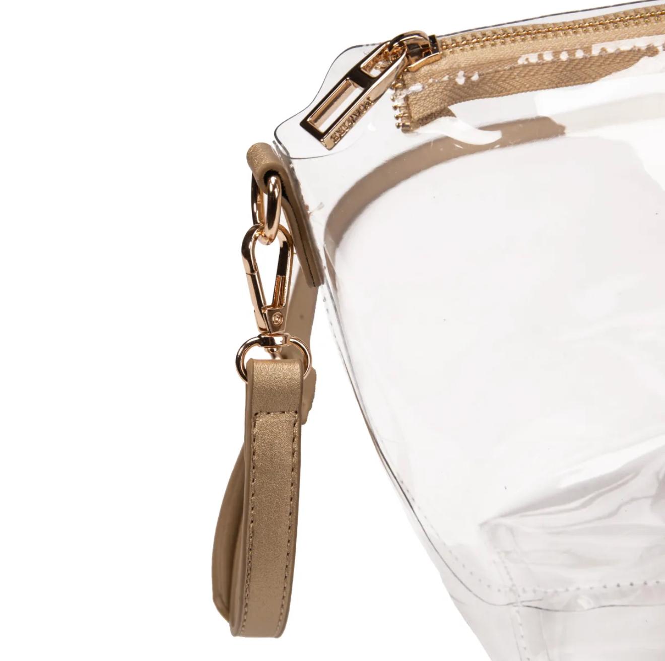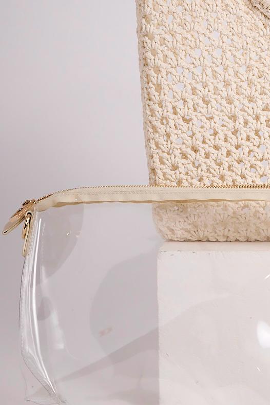 Sac accompagné de sa pochette transparente grand format et d'une bandoulière longue.